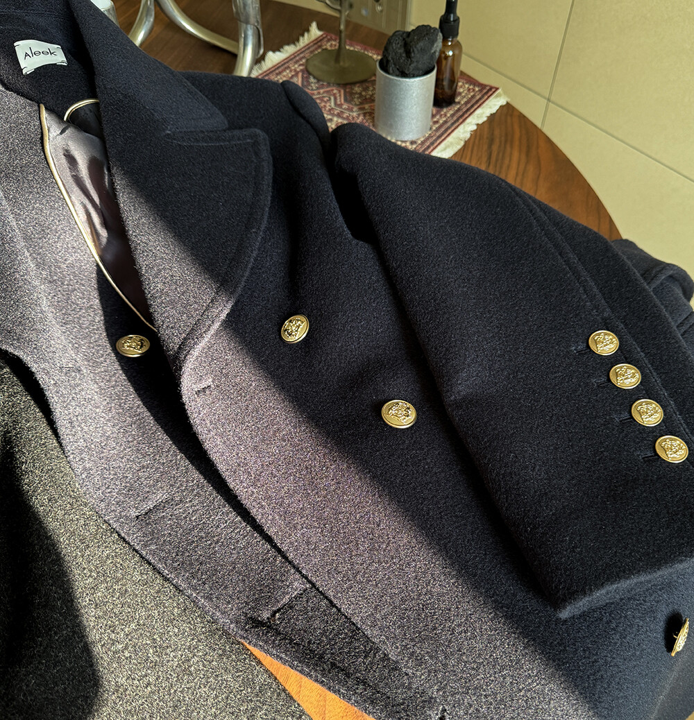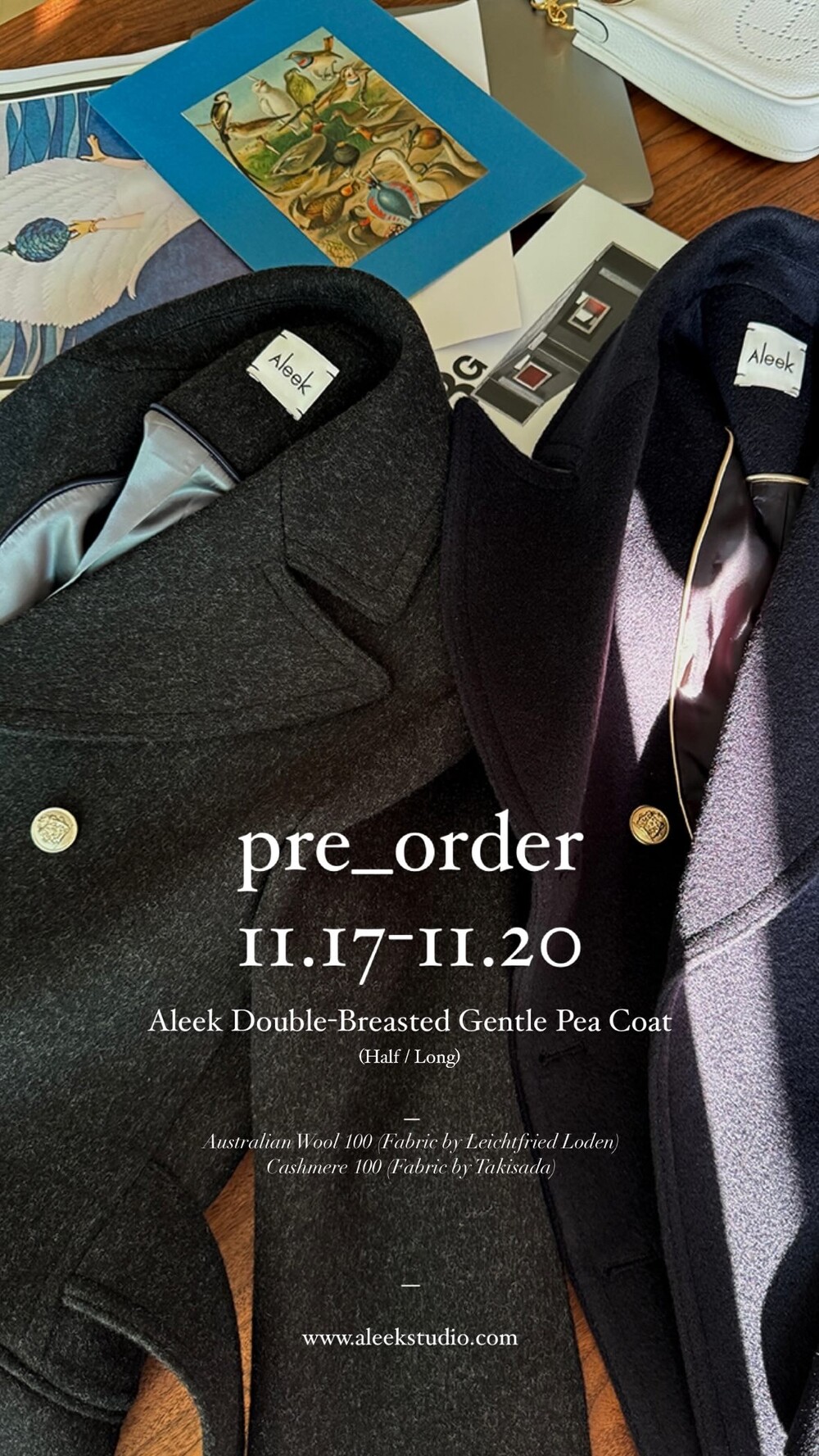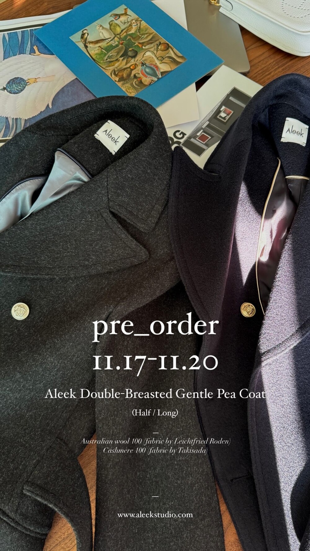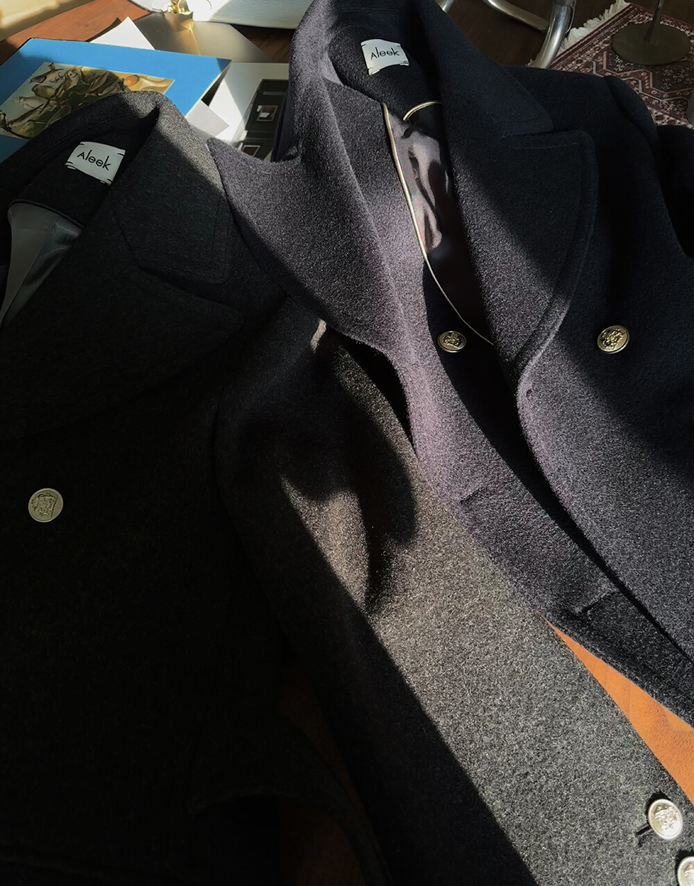 넓은 라펠은 바람이 많이 부는 배 위에서 찬 바람을 막아 주는 보온의 역활을 하면서 따뜻함을 더 해주고 싱글 보다 한겹 더 여며지는 더블브레스트로 보온력과 함께 실용성과 내구성이 더해져 지금까지 다양한 디자이너들에게 영감과 사랑을 주며 각자의 브랜드 아이텐티티를 내포한 디자인으로 선보 이고 있습니다. 타임리스한 디자인과 클래식 디자인을 연구 개발하는 아리크에서, 여성성과 남성적인 다자인 디테일을 재구성한 아리크 젠틀 시그니처 코트, Aleek Double-Breasted Gentle Pea Coat 24FW 버전을 선보입니다.