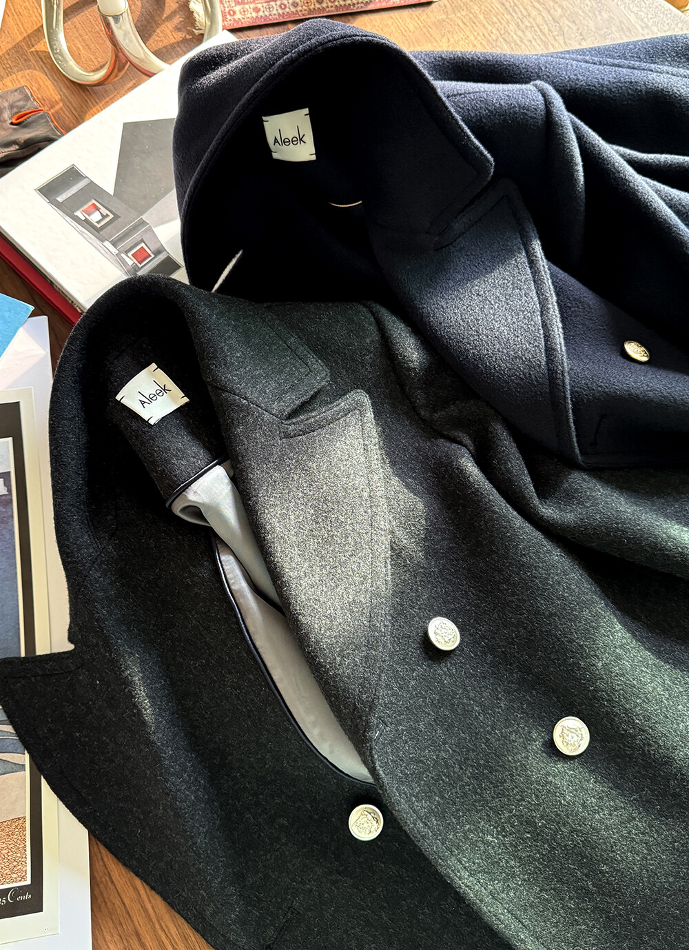 Aleek Cashmere100 Double_Breasted Gentle Pea Coat_Navy Black (LONG)