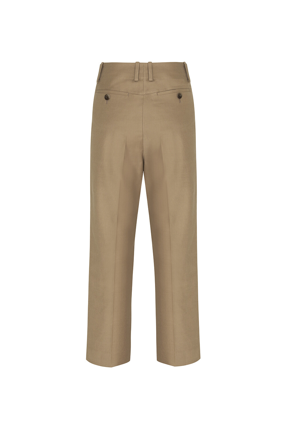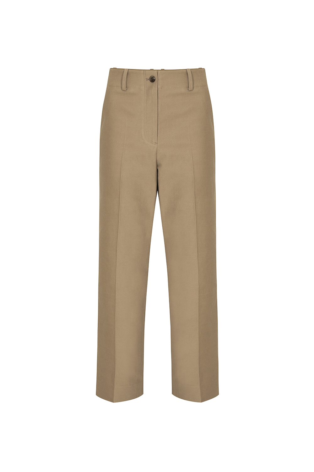 계절의 온도 변화에 대응하면서도 형태감과 내구성이 높은 적당한 중량감이 돋보이는 원단으로 우연한 드레이프를 만들면서도 스트레이트 실루엣의 직선미를 유지해 다리가 길어 보이며 세심하고 정갈한 봉제마감으로 제작되었습니다.