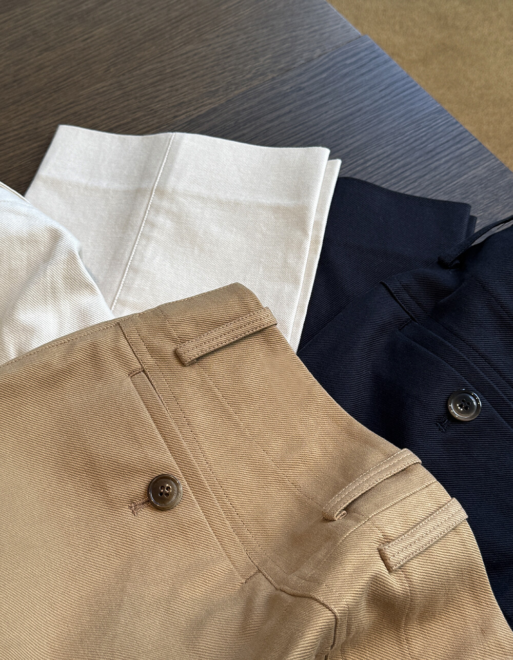이 치노팬츠에 사용된 원단은 SHIBAYA의 시그니처 트윌 구조를 기반으로 코튼 96% + 폴리우레탄 4 의 혼용률로 유연함과 견고함을 동시에 구현했습니다. 300g대 중량의 밀도 있는 원단은 가을·겨울 시즌에 최적화된 두께로, 입었을 때 몸을 감싸주는 안정감이 느껴지며 300g대의 밀도는 가을에서 겨울까지 포근하게 착용하기 좋은 보온성을 유지하면서도 트윌 조직 특유의 사선 결은 빛에 따라 은은한 그라데이션을 만들어내며 원단 자체의 탄력과 흐름을 잃지 않게 해주며 앉거나 움직일 때 자연스럽게 흐르는 실루엣을 연출합니다. 여기에 4%의 폴리우레탄이 소량 혼용되어 있어 신축성이 섬세하게 살아있어 일상에서 움직일 때 필요한 유연성과 복원력이 뛰어나며 잦은 착용에도 형태 유지가 좋아 실루엣이 오래도록 깨끗합니다.