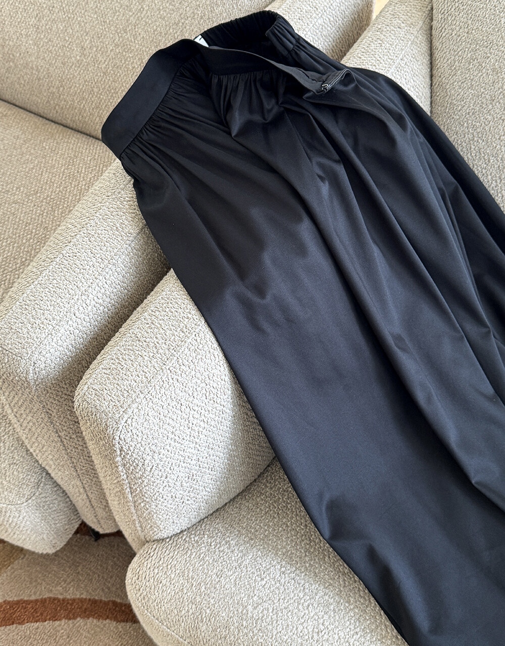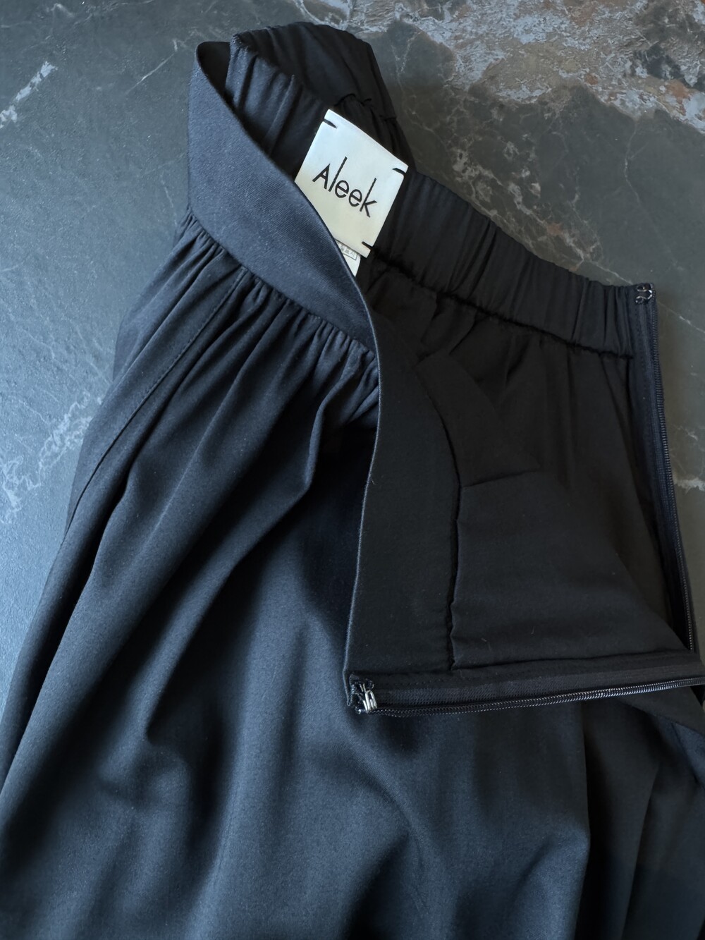 허리단 아래로 잔잔하게 들어간 주름은 주름의 모양을 하나하나 잡아 작업하는 핸드작업 방식으로 많은 양의 원단의 주름이 뭉치지 않으면서 한층 더 자연스럽고 원단의 흐름에 거스르지 않게 라인이 한층 더 예쁘게 떨어질 수 있게 작업을 하는데 신경을 썼습니다.