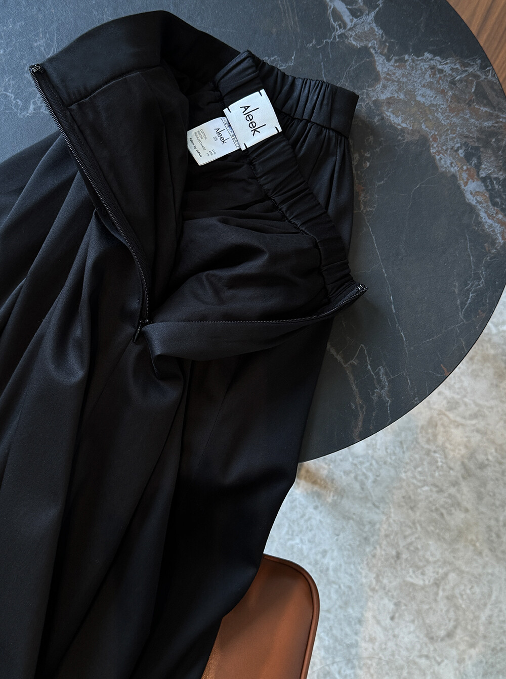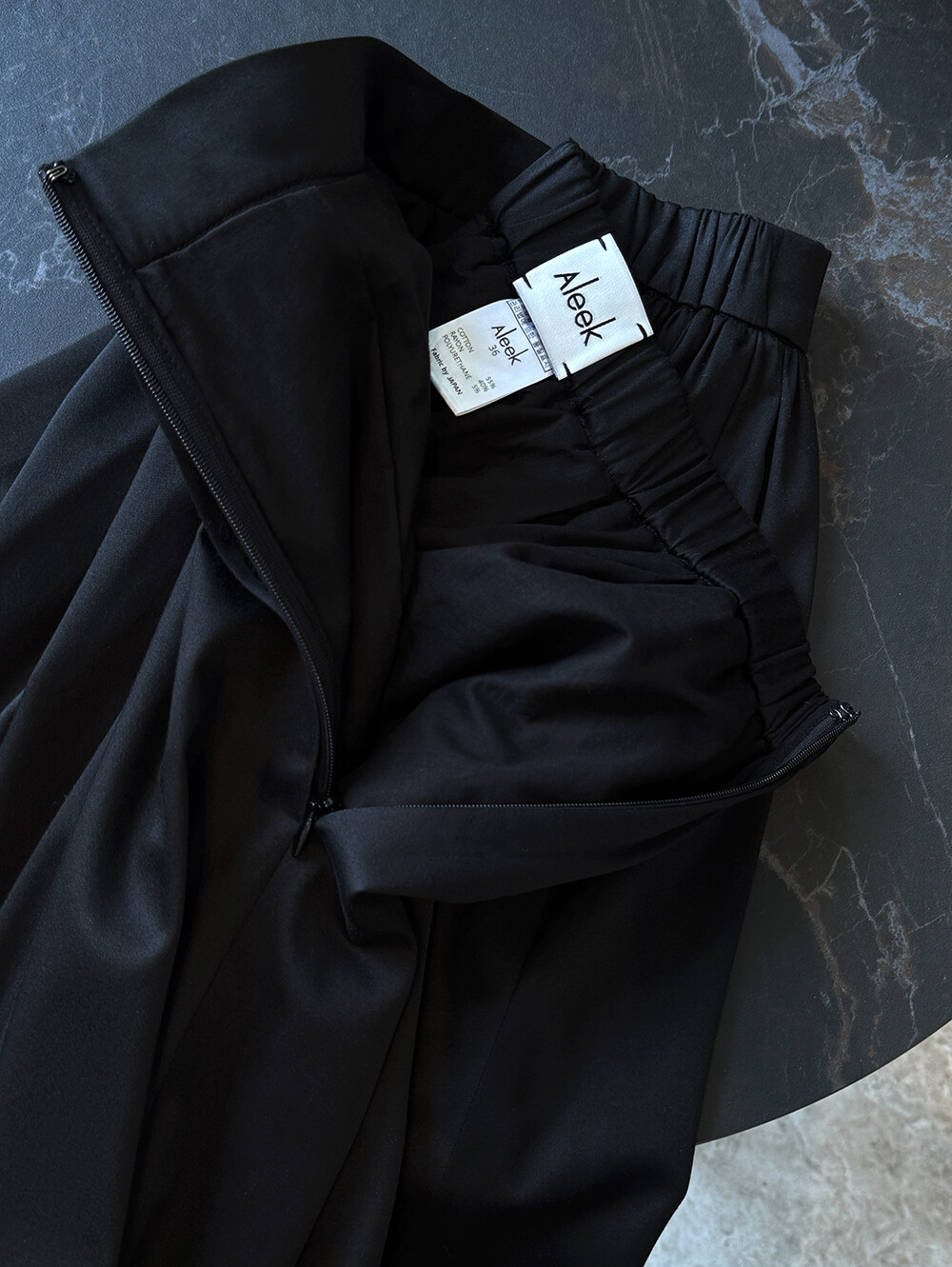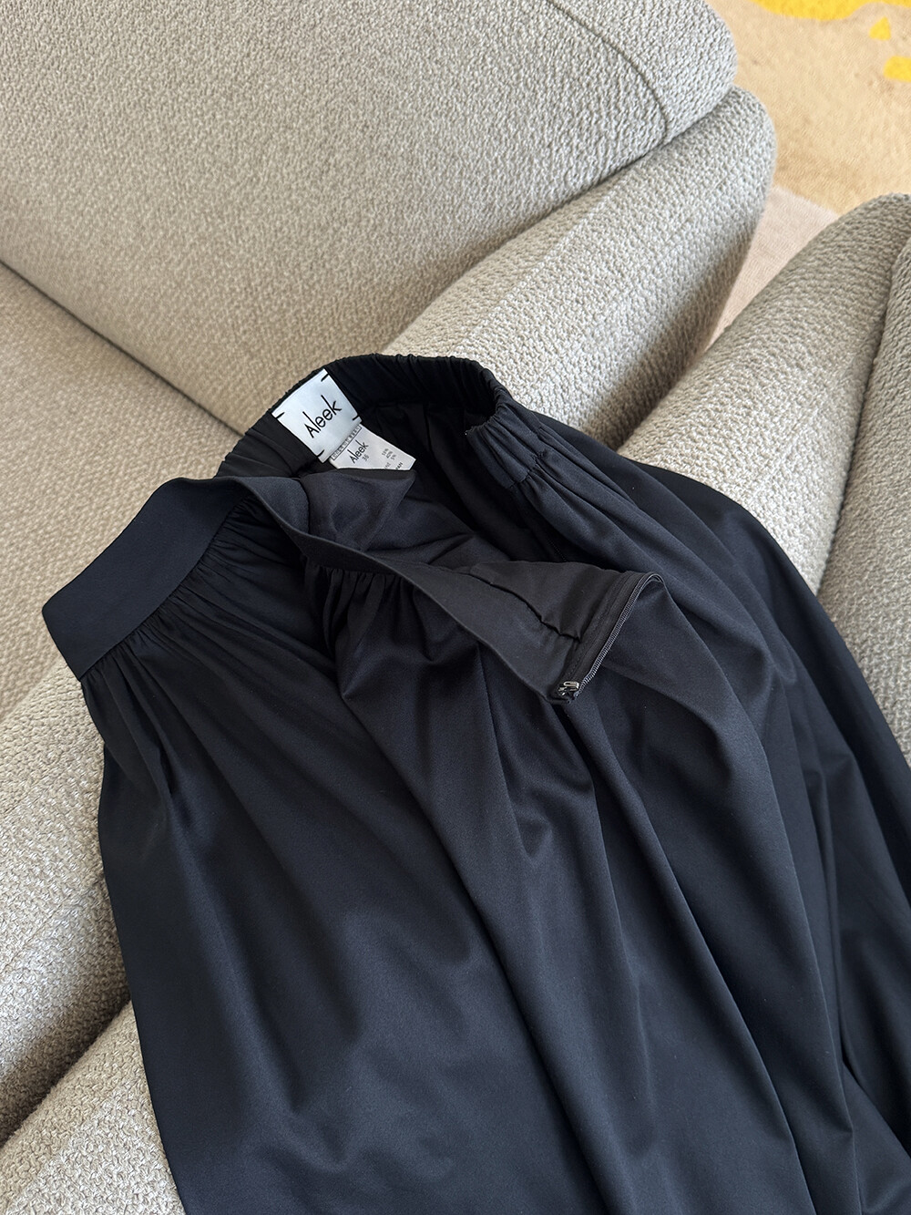 스커트의 옆 라인 지퍼로 오픈/ 클로징 하실 수 있으며 지퍼옆 마감 또한 안감 원단으로 한번 감싸(해리작업) 옷 마감의 퀄리티를 한층 더 업그레이드 하였습니다.