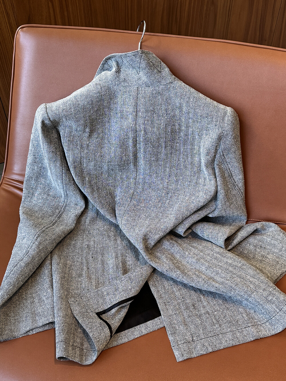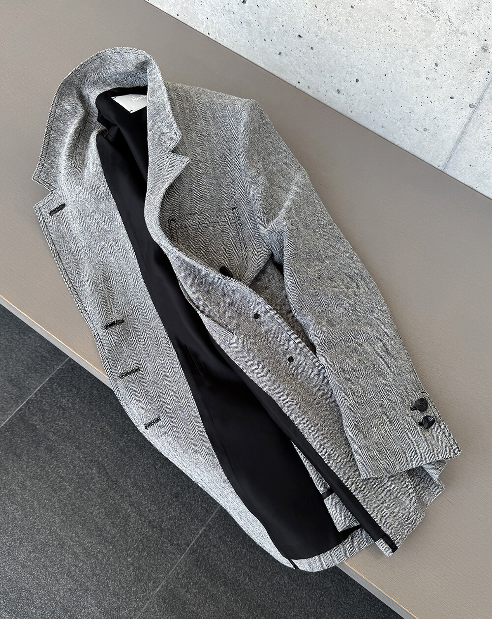 뒤판은 별도의 과장된 절개 없이도 자연스럽게 이어지는 허리 라인을 중심으로, 체형을 부드럽게 감싸는 곡선의 흐름을 강조했습니다. 인위적으로 조형된 라인이 아닌, 착용자의 움직임에 따라 유연하게 반응하는 실루엣으로 설계되어 편안함과 단정함을 동시에 전달합니다. 어깨는 패드를 배제하고, 과장되지 않은 여유를 남긴 채 소매와 자연스럽게 연결되도록 패턴을 구성했습니다. 이로 인해 오버핏이 아님에도 불구하고 답답함 없이 부드럽게 흐르는 숄더 라인을 완성하며, 팔의 움직임까지 고려한 입체적인 연결 구조가 특징입니다. 뒤판의 중심에는 슬릿이 있으며, 편안한 소매 움직임과 편안하게 자켓의 라인을 즐기실 수 있습니다.