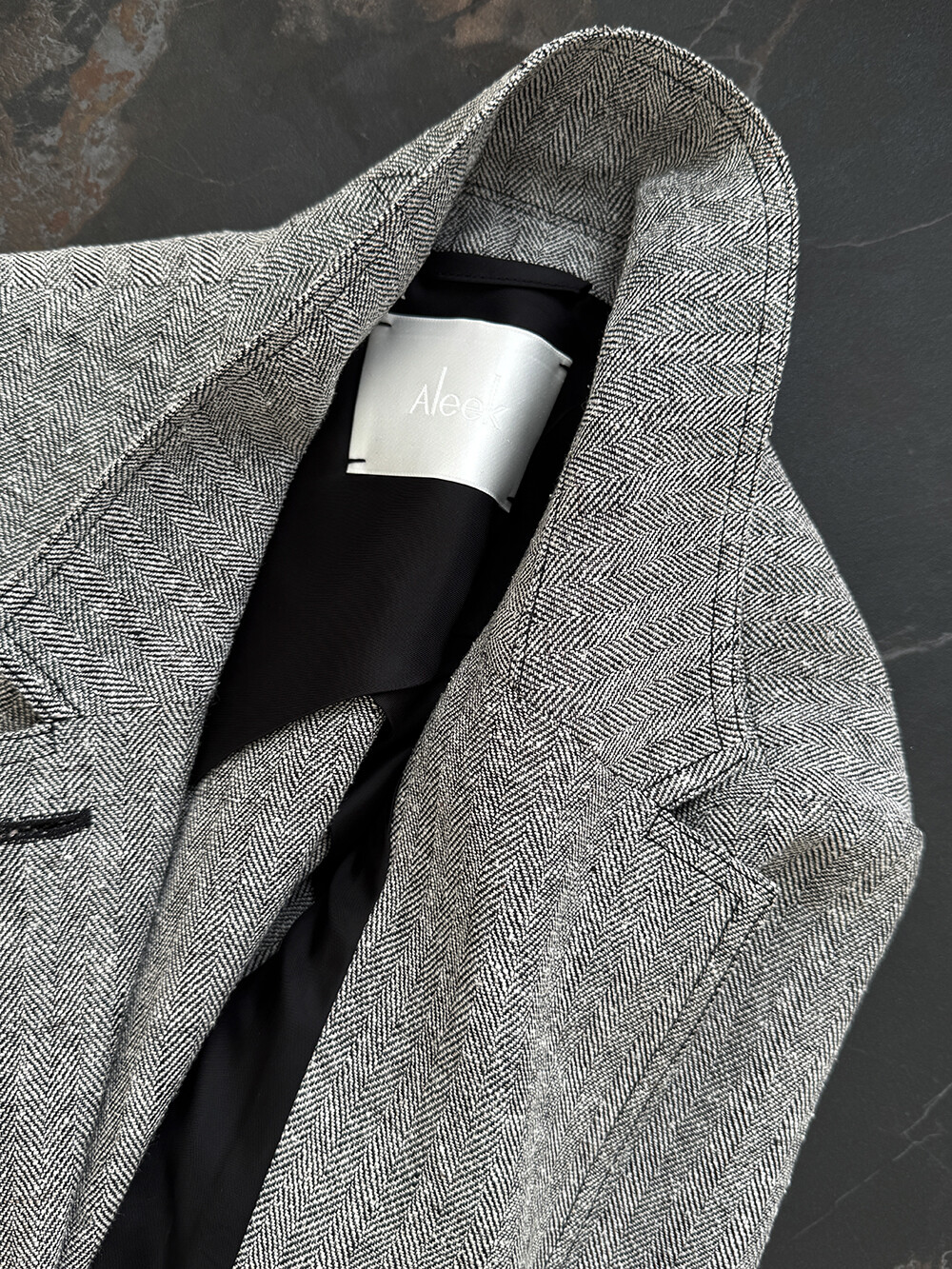 버튼은 높낮이가 다른 입체적인 마블 텍스처 버튼과 포인트로 사용한 금장 포인트 버튼을 믹스하여 적용함으로써, 절제된 패턴 위에 미묘한 리듬감을 더했습니다. 전체적인 구조는 미니멀하게 유지하면서도 디테일에서 아리크 특유의 테일러드 방식의 세련된 감도를 드러냅니다.