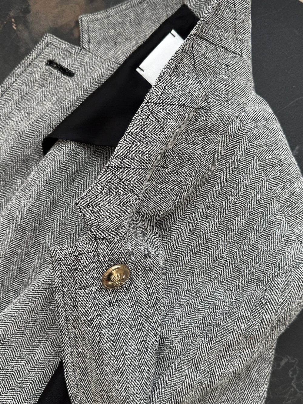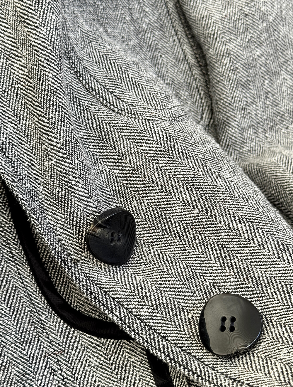 여기에 다른 스타일의 단추를 제안 함으로써, 라펠 뒤에 사용한 금장 단추와 몸판의 메인단추인 마블 단추의 이질적인 소재감이 어우러지는 즐거움을 느끼실 수 있습니다.