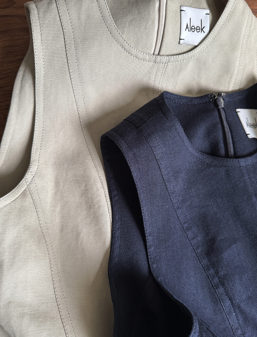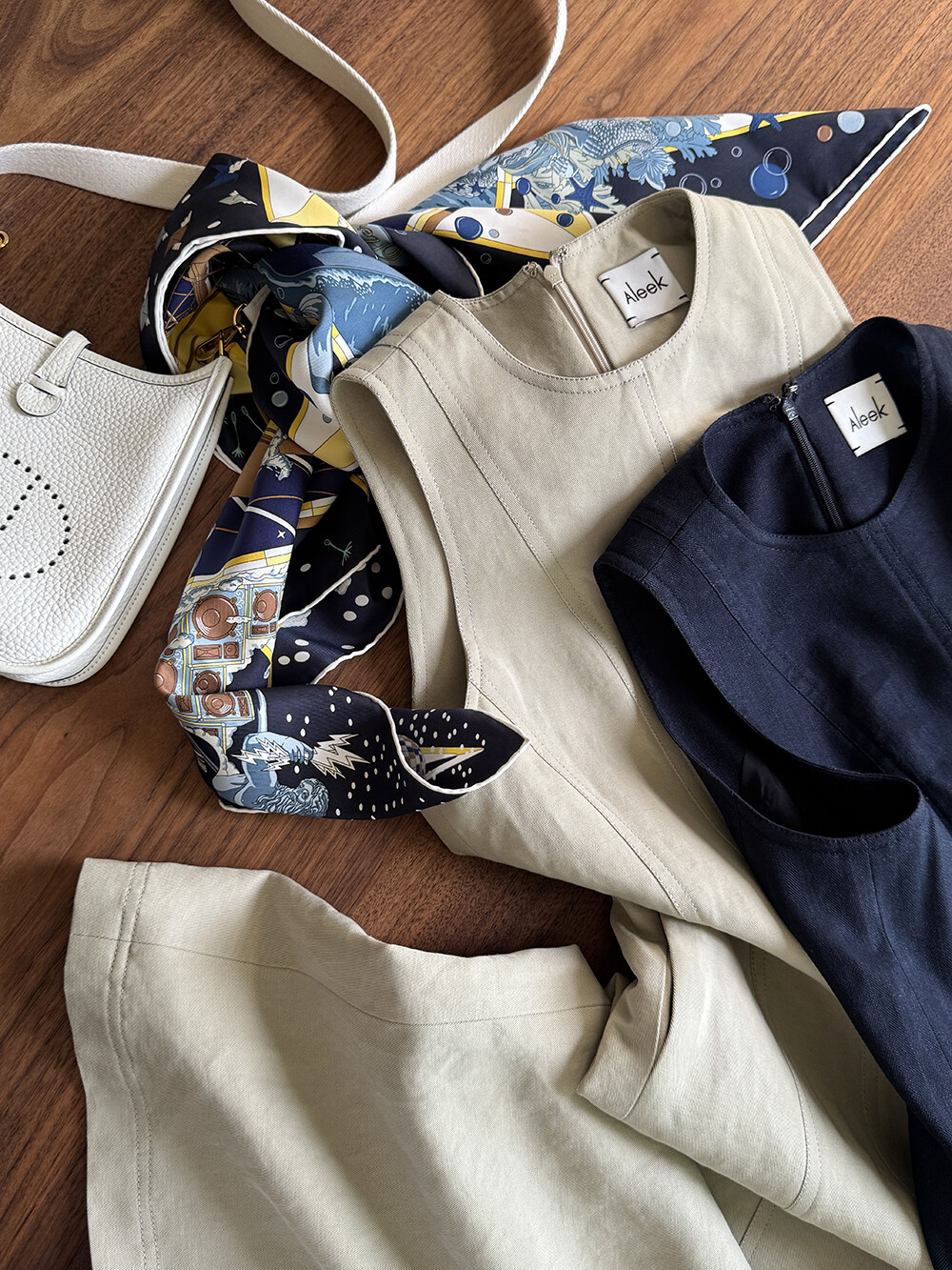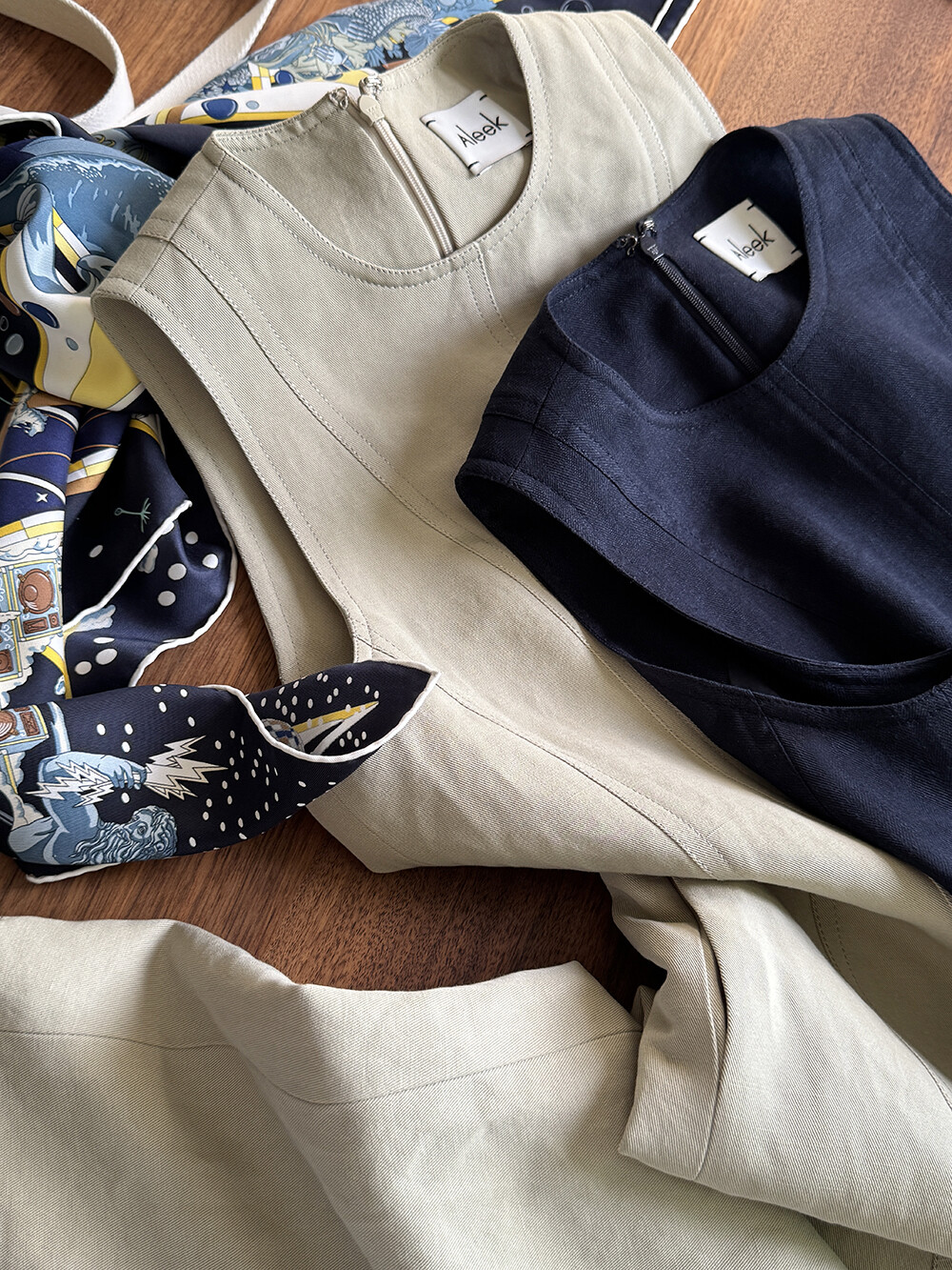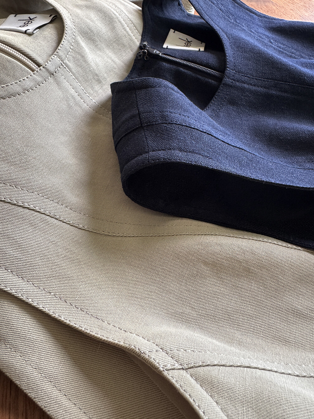 이번 원피스 첫번째 원단으로 셀렉된 코튼 / 린넨 전문회사로 명성을 떨치고 있는 Tipico 사의 New Arrive 한 25SS 원단은 트윌로 재직된 코튼사 린넨사의 치밀하게 짜여진 무게감이 적당히 느껴지는 원단으로 원단의 흐름이 가볍지 않고 무게감이 느껴지면서