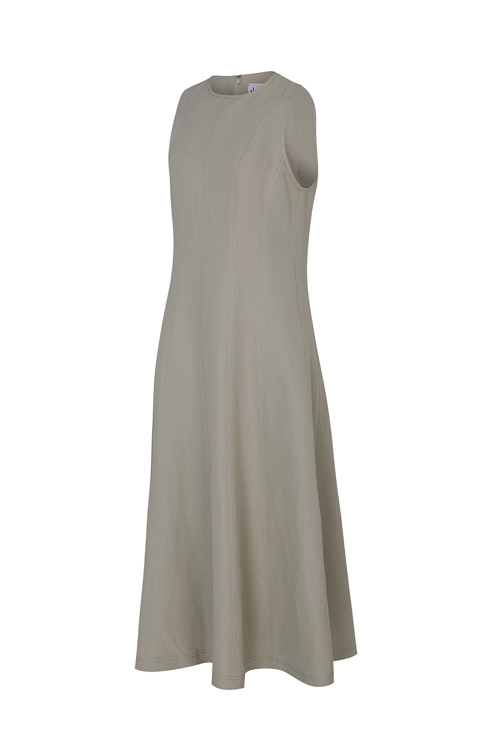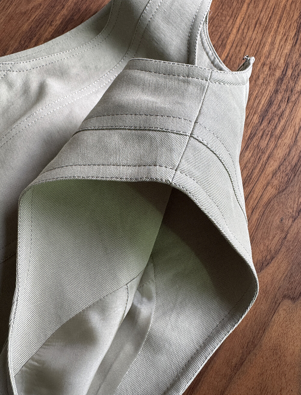 네크라인 부터 밑단까지 이어지는 긴 절개선과 가슴라인의 숨은 다트를 넣어 입체패턴으로 디자인하여 심플하지만 원피스 자체에서 입체감이 느껴져 가슴과 암홀의 착용감이 한층 편하면서 네크라인과 암홀 그리고 가스부분부터 이어지는 허리라인이 끊김없이 자연스럽고 부드럽게 이어집니다.