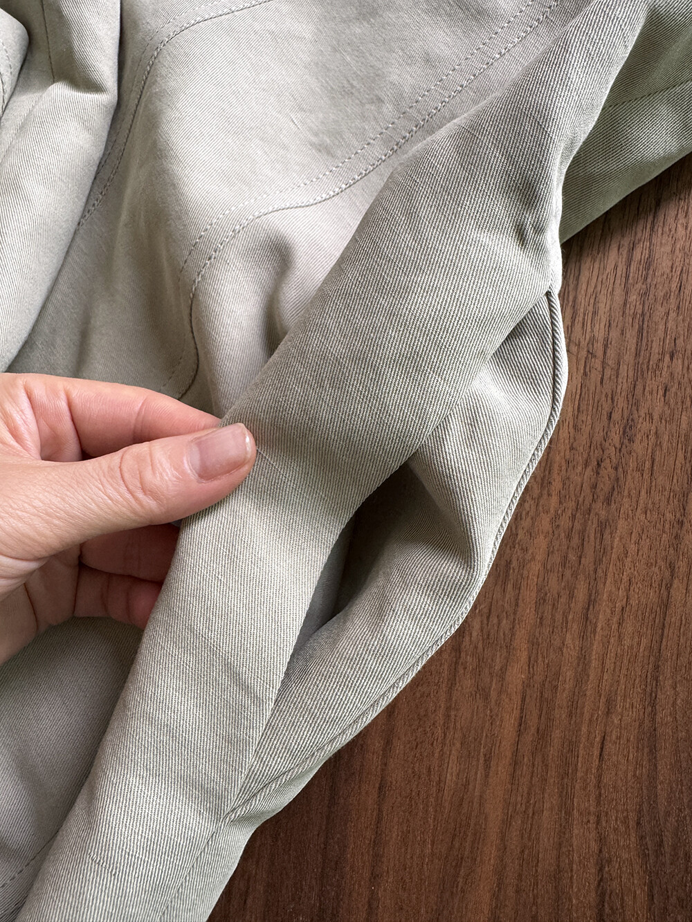 이번 원단의 큰 특징으로 다량 사용된 코튼/린넨원사의 묵직한 중량감에도 구김이 덜하면서 통기성, 쿨링감이 굉장히 뛰어나며