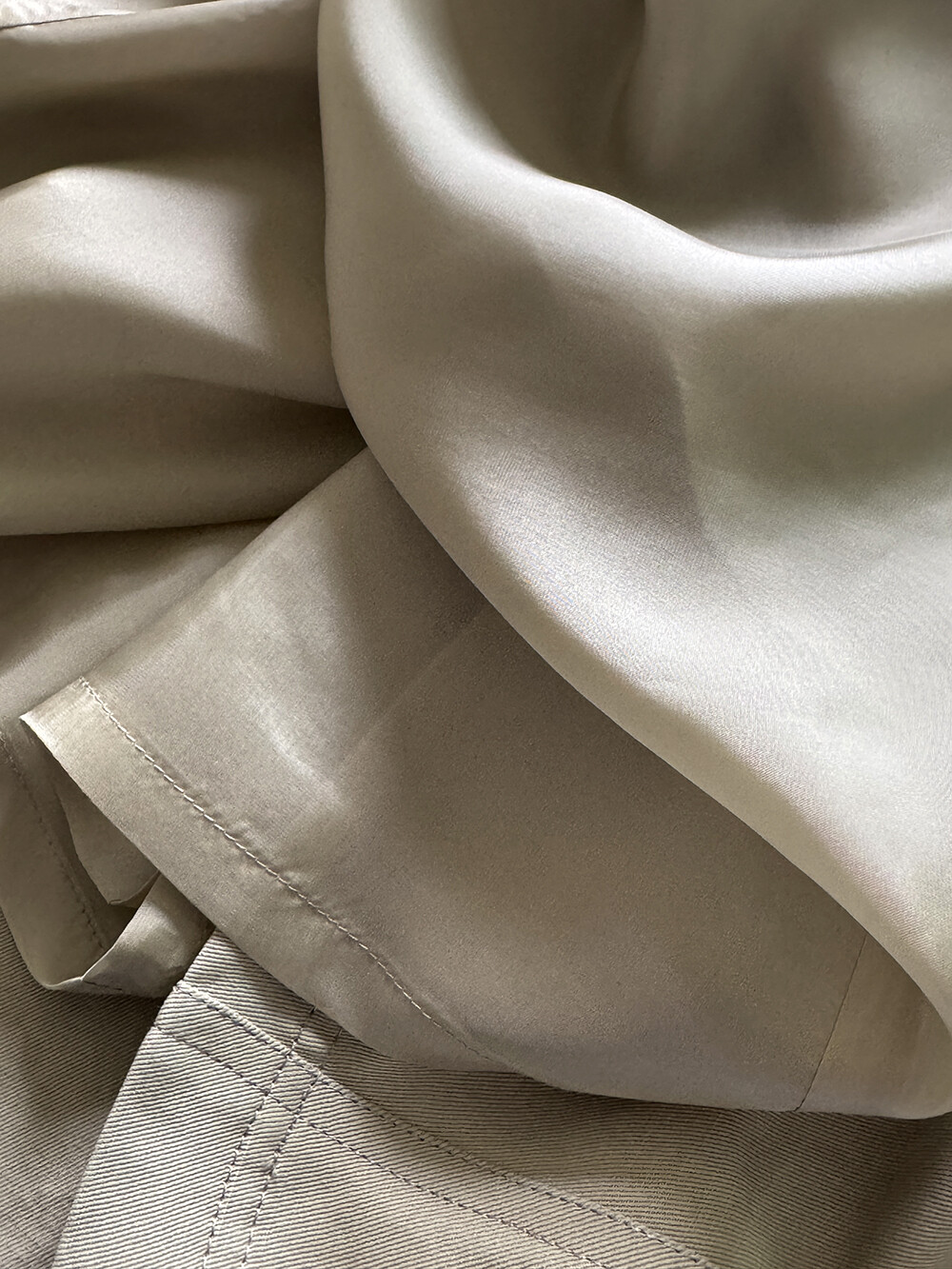 울실크 같은 고급스러운 매트 실키함이 돋보이는 원단으로 입체적으로 디자인된 이번 원피스의 절개라인을 잘 살려주면서 너무 드레시 하지 않은, 캐주얼함과 네추럴함 그리고 드레시함의 사이를 충분히 즐기실 수 있는 원단 입니다.