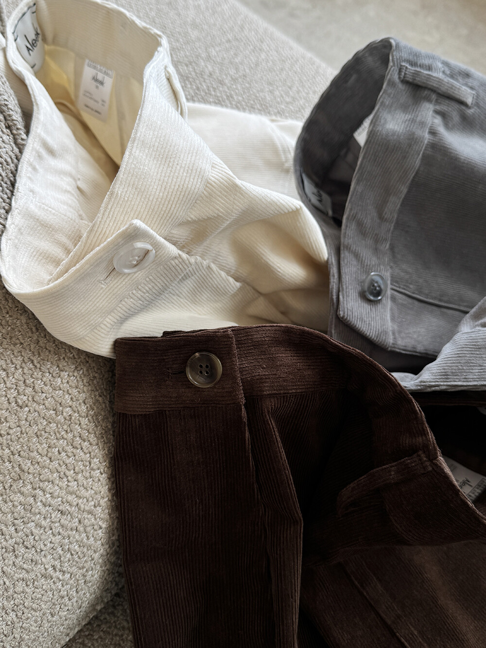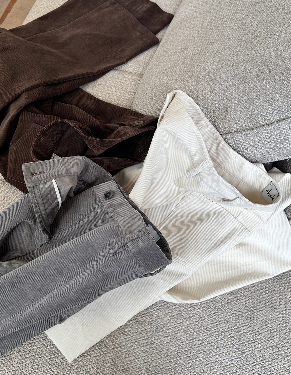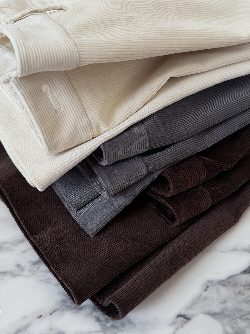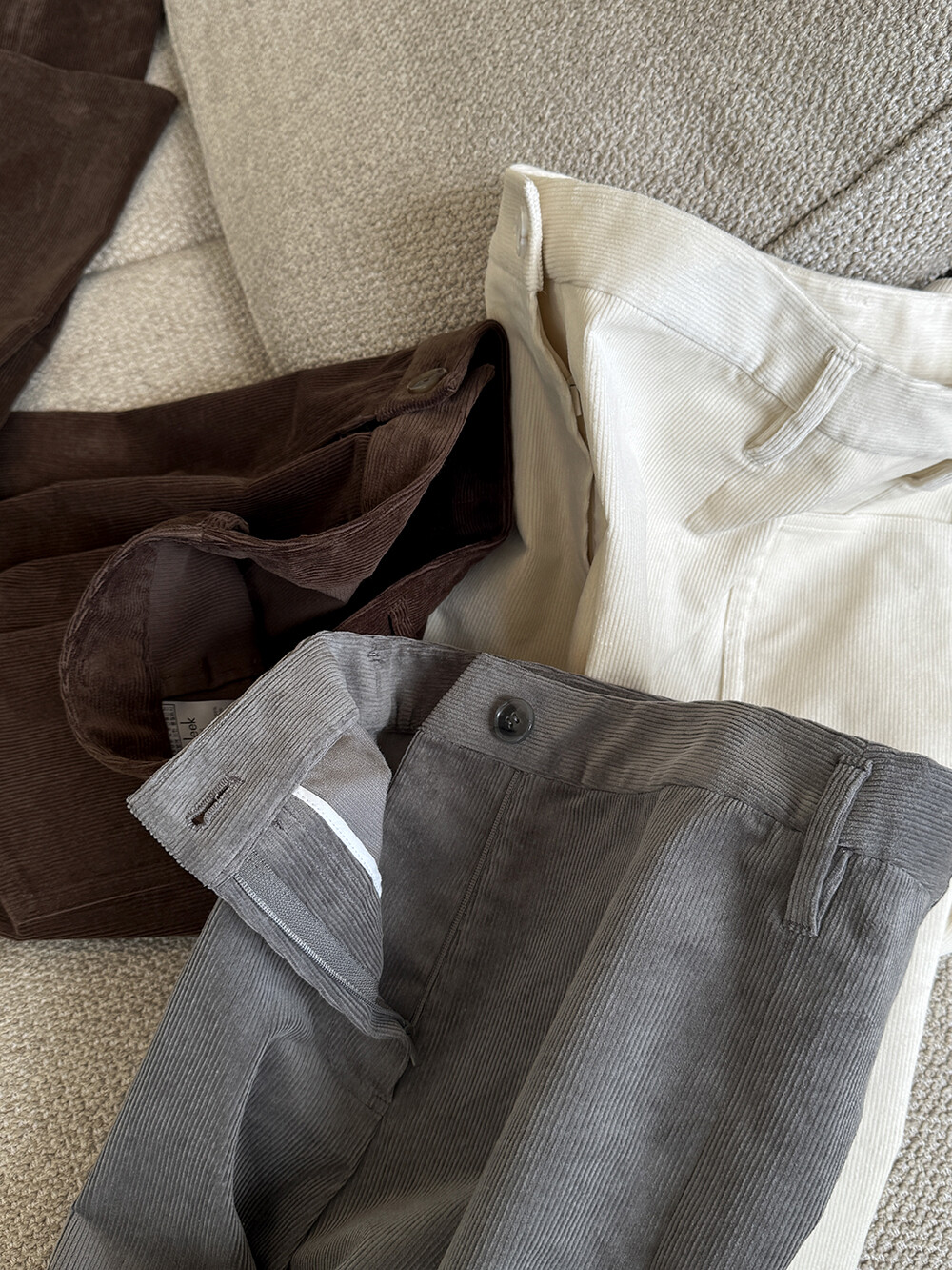 은은하게 고급스러움을 표출하고 있는 자연스러운 코듀로이 특유의 광택감은, 이번에 제안드리는 3가지 컬러에서 한층 더 고요하고 우아하게 흐르는 품격있는 세련된 컬러들로 정교함을 느끼실 수 있으며 흔하지 않은 감도 높은 컬러와 코듀로인 팬츠 골(웨일)의 음영에서 깊이감 있는 겨울 스타일링에 자연스러운 온기를 더해주고 있습니다.