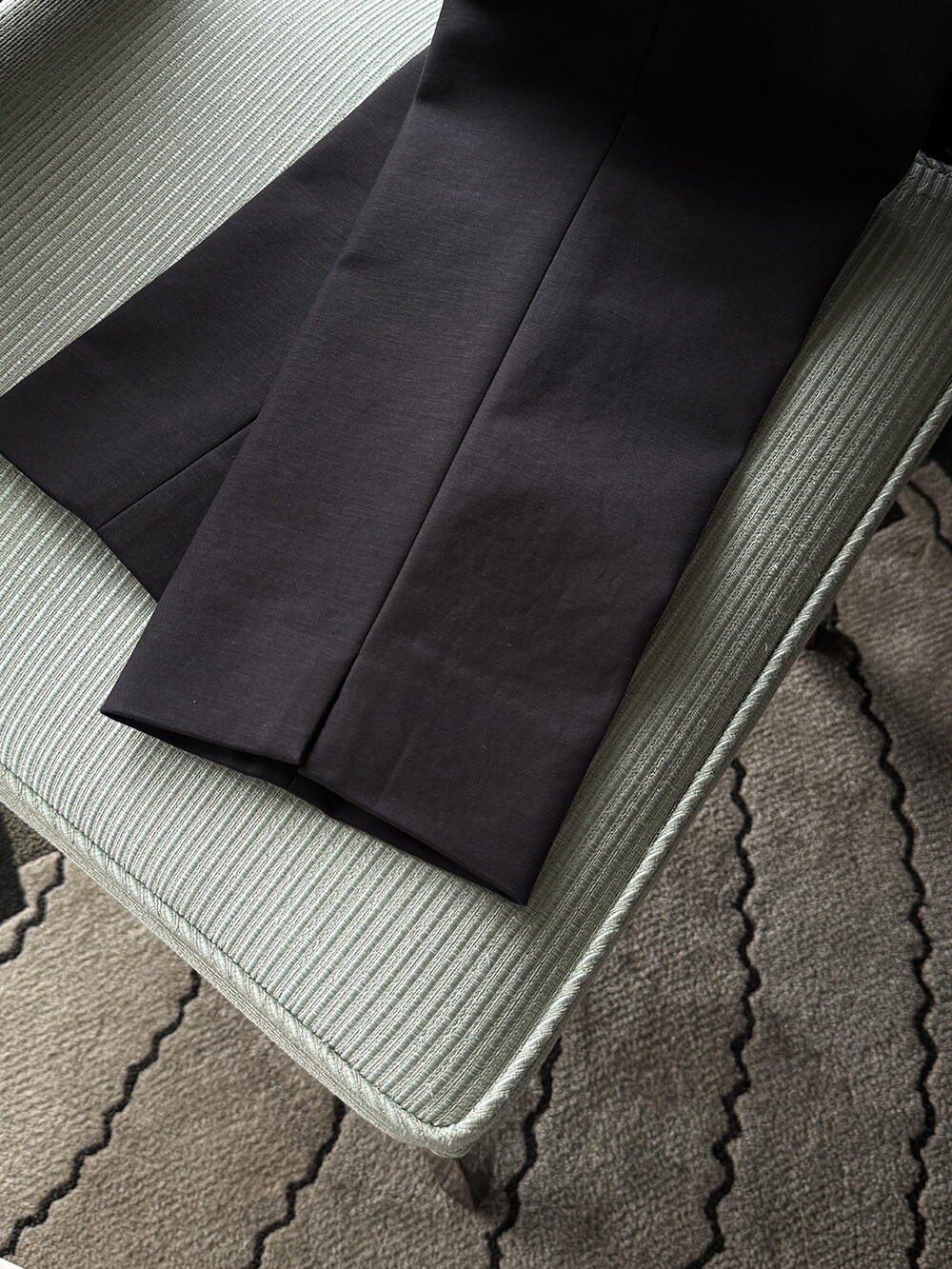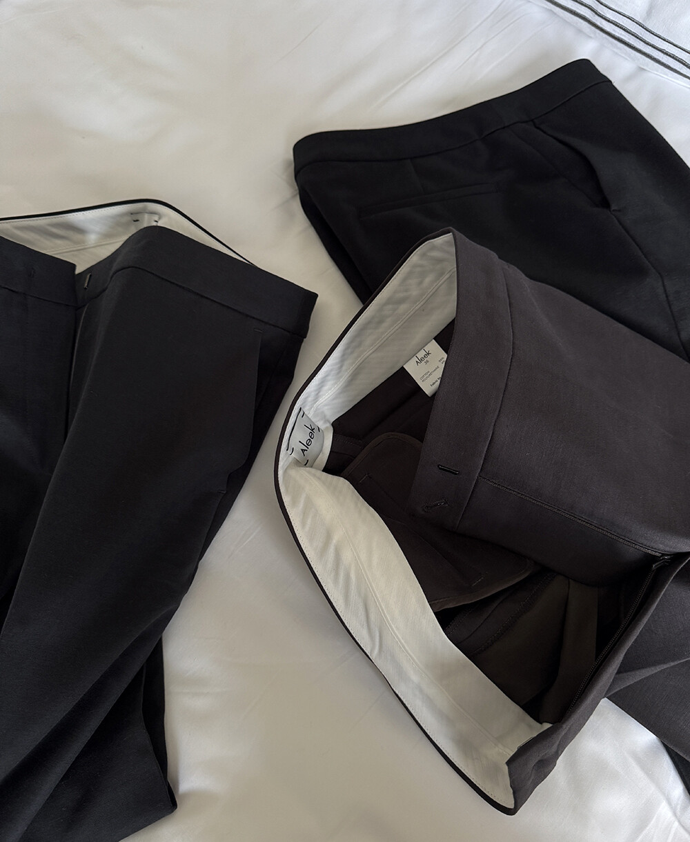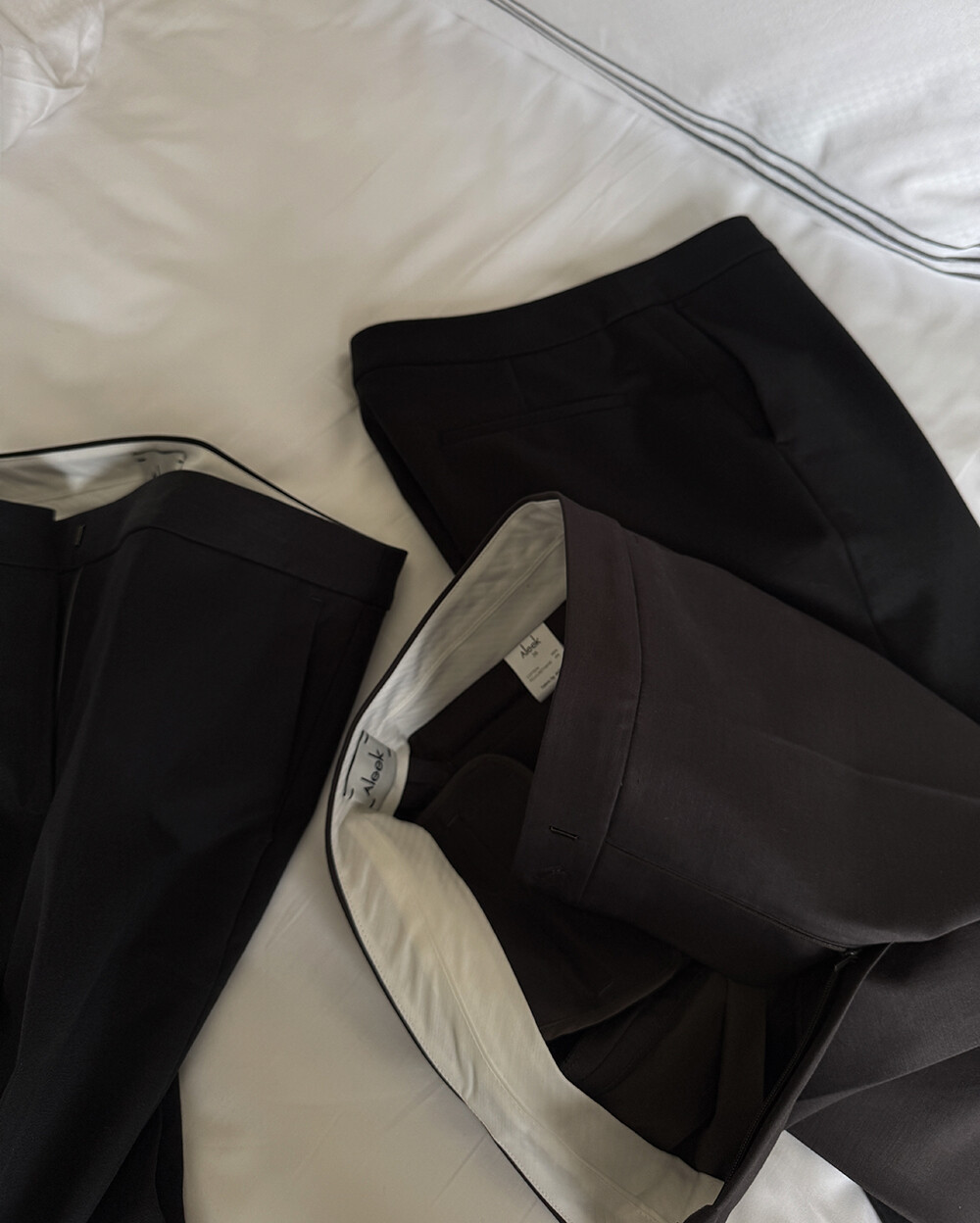 배꼽 선, 혹은 배꼽 조금 아래(개인의 신체조건에 따라 위치는 달라질 수 있습니다.)에 떨어지는 밑위감으로 안정감 있는 착용감과 테일러드 감성으로 허리선이 가늘어 보일 수 있는 허릿단 너비, 다트 또한 보여지지 않게 패턴안에 숨겨 작업되어, 말 그대로 미니멀하게 라인이 정리된 팬츠를 만나보 실 수 있습니다. 밑단은 사이드 슬릿으로 움직임의 실용성은 물론 팬츠가 떨어지는 실루엣을 한층 더 길고 슬림하게 표현해 줍니다.