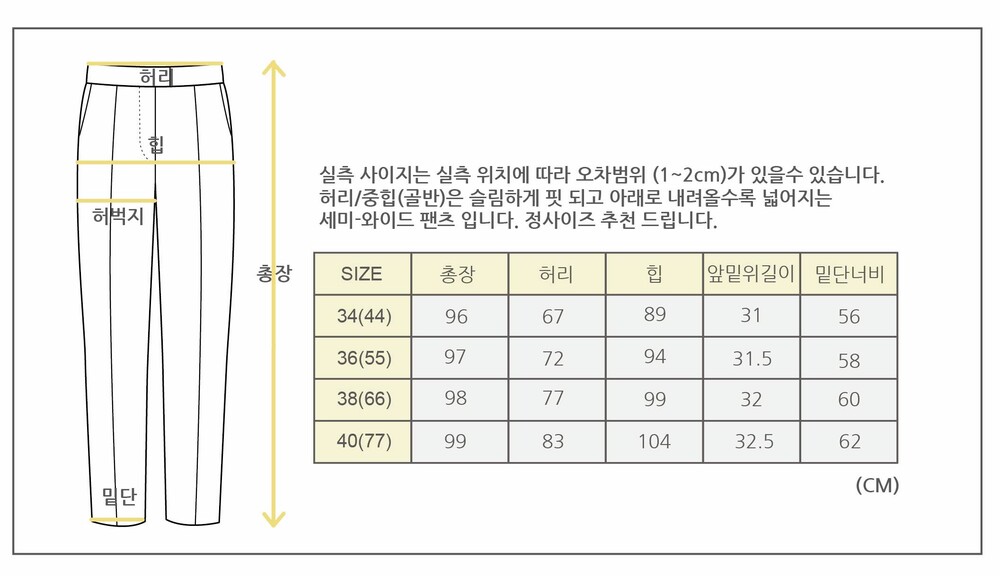 -골반라인이 슬림한 팬츠 입니다. 골반 / 아랫배가 있으신 분들은 정사이즈에서 +1~1.5cm 맞춤사이즈 권장 드립니다.
