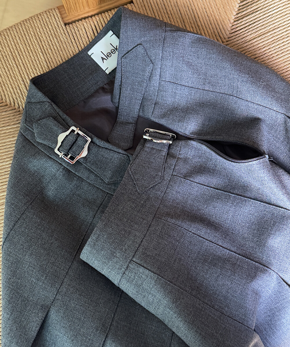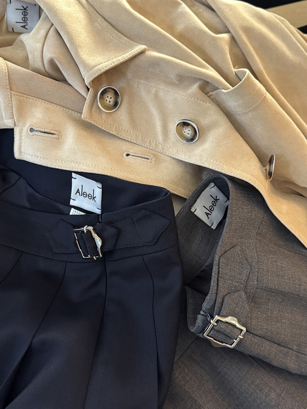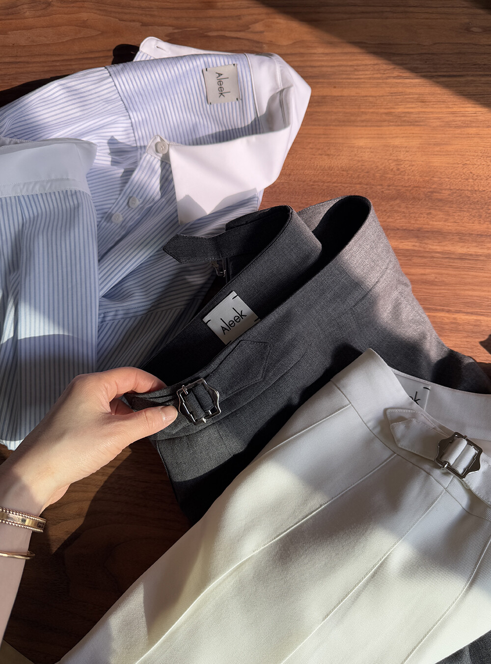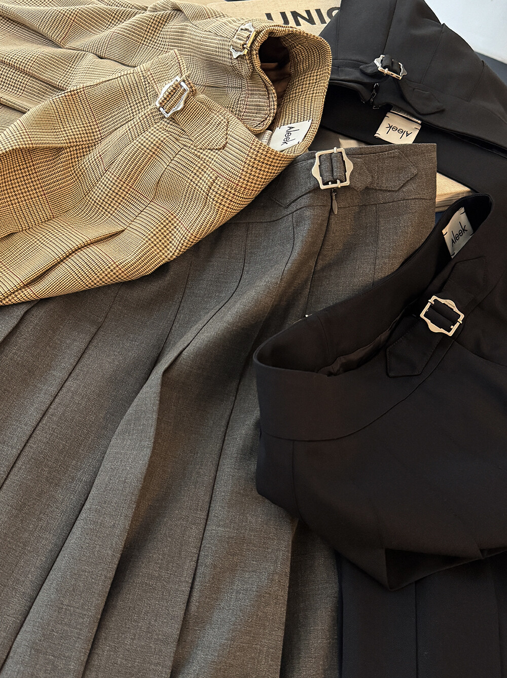 울 스커트에는 기계주름 보다는 손주름으로 주름을 하나하나 잡아 라인의 정교함과 가볍지 않게 움직이는 플리츠 스커트의 생동감과 운동감을 넣어 움직임이 조금 더 우아한 느낌이 들게 제작 하였고 일본에서 수입한 아이리스 사의 고급 비조버클을 사용하여 허리에 포인트 디테일로 남성 테일러 팬츠에서 볼 수 있는 클래식한 비조장식을 더했습니다.