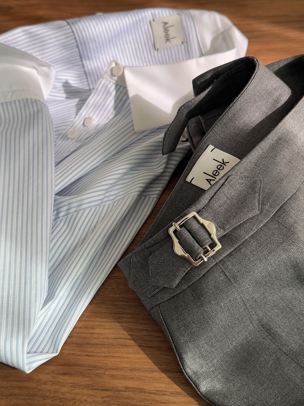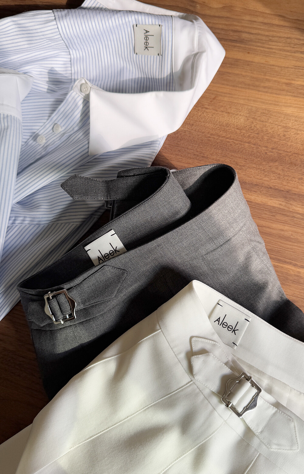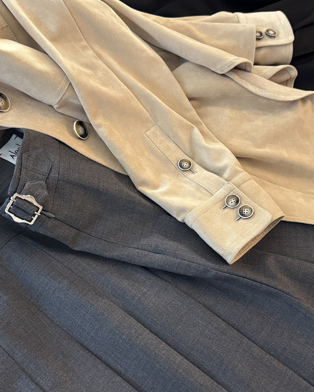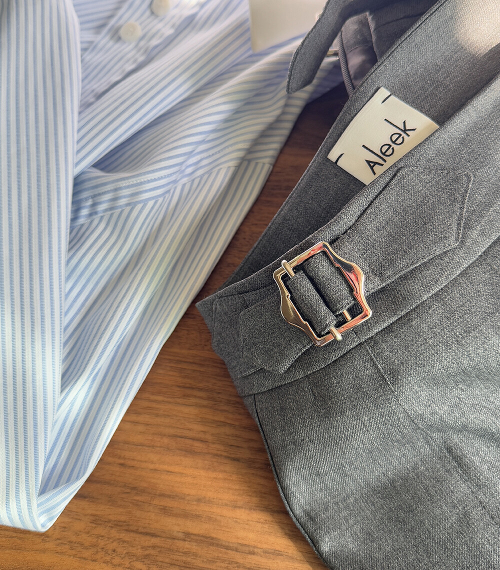 울 스커트에는 기계주름 보다는 손주름으로 주름을 하나하나 잡아 라인의 정교함과 가볍지 않게 움직이는 플리츠 스커트의 생동감과 운동감을 넣어 움직임이 조금 더 우아한 느낌이 들게 제작 하였고 일본에서 수입한 아이리스 사의 고급 비조버클을 사용하여 허리에 포인트 디테일로 남성 테일러 팬츠에서 볼 수 있는 클래식한 비조장식을 더했습니다.
