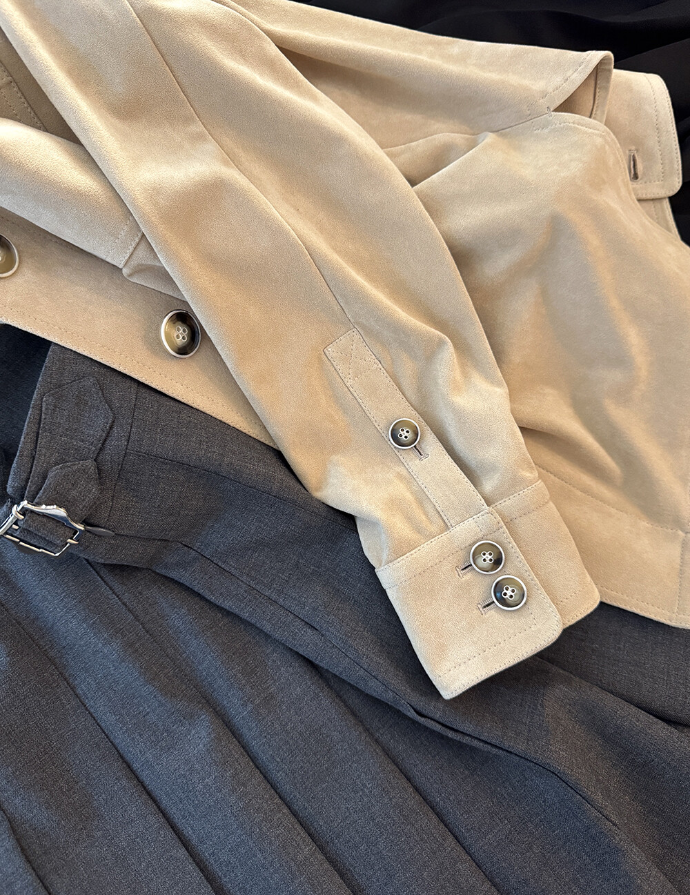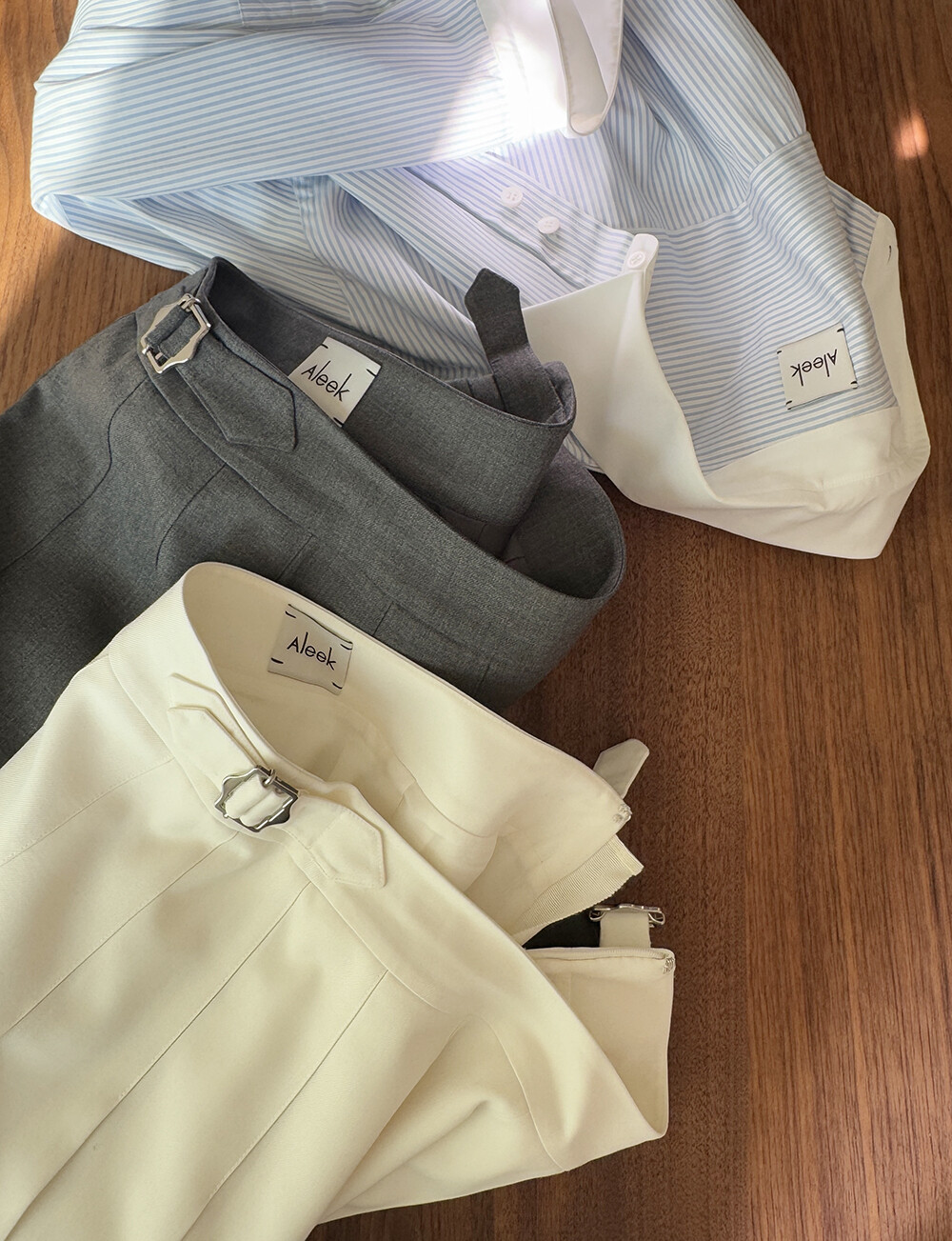 테일러드 감성의 포인트 비조 장식을 더해 허리 라인에 포인트를 주었고 버클의 은은한 니켈광이 가볍지 않게 장식되어 스커트의 완성도를 느끼실 수 있습니다.