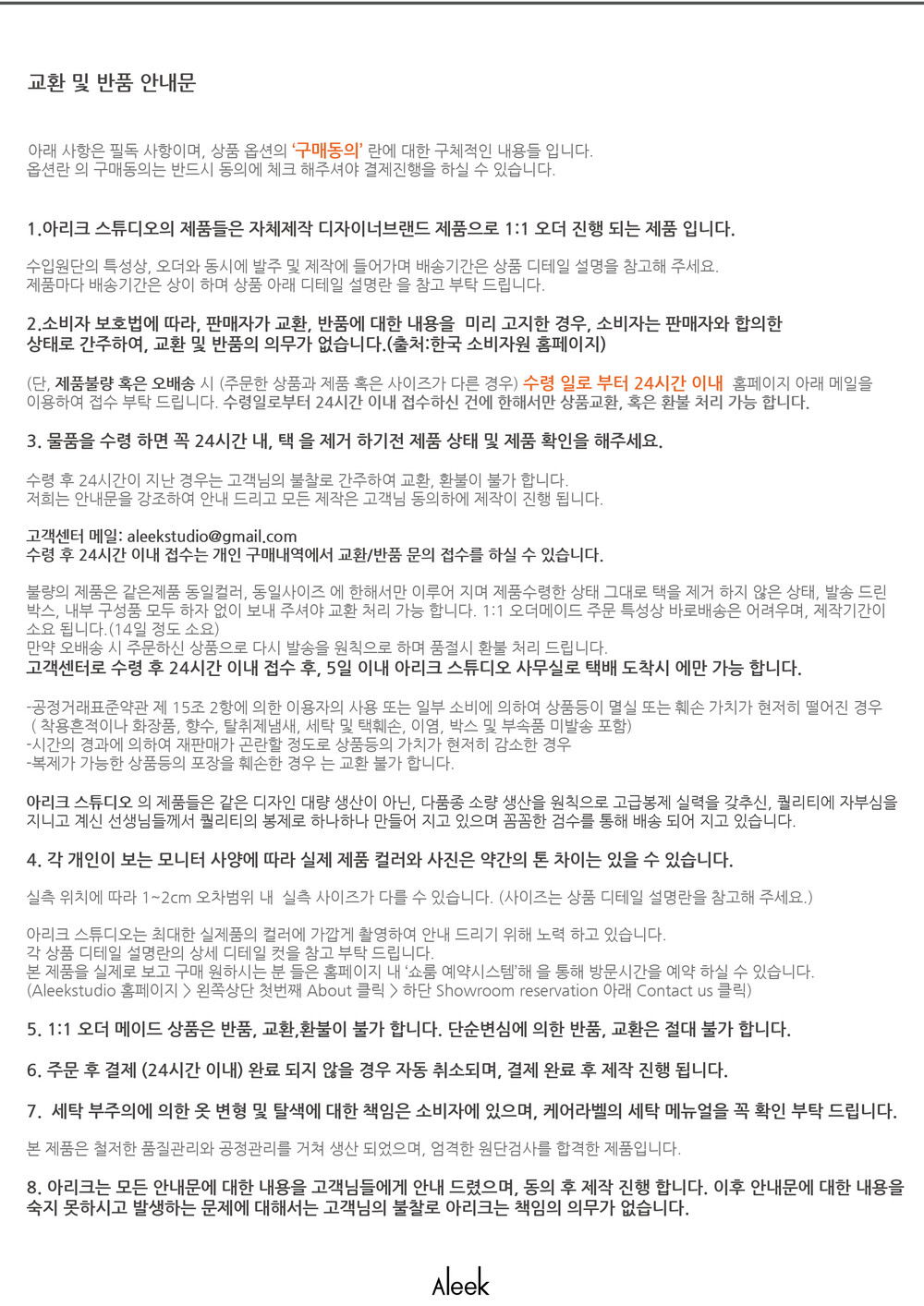 >제품구매시 상세내용 하단의 '교환 및 반품' 내용을 꼭 숙지 하여 주시기 바랍니다.