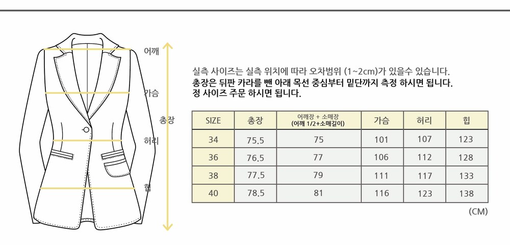 사이즈: 34(44), 36(55), 38(66), 40(77) 정 사이즈 입니다.