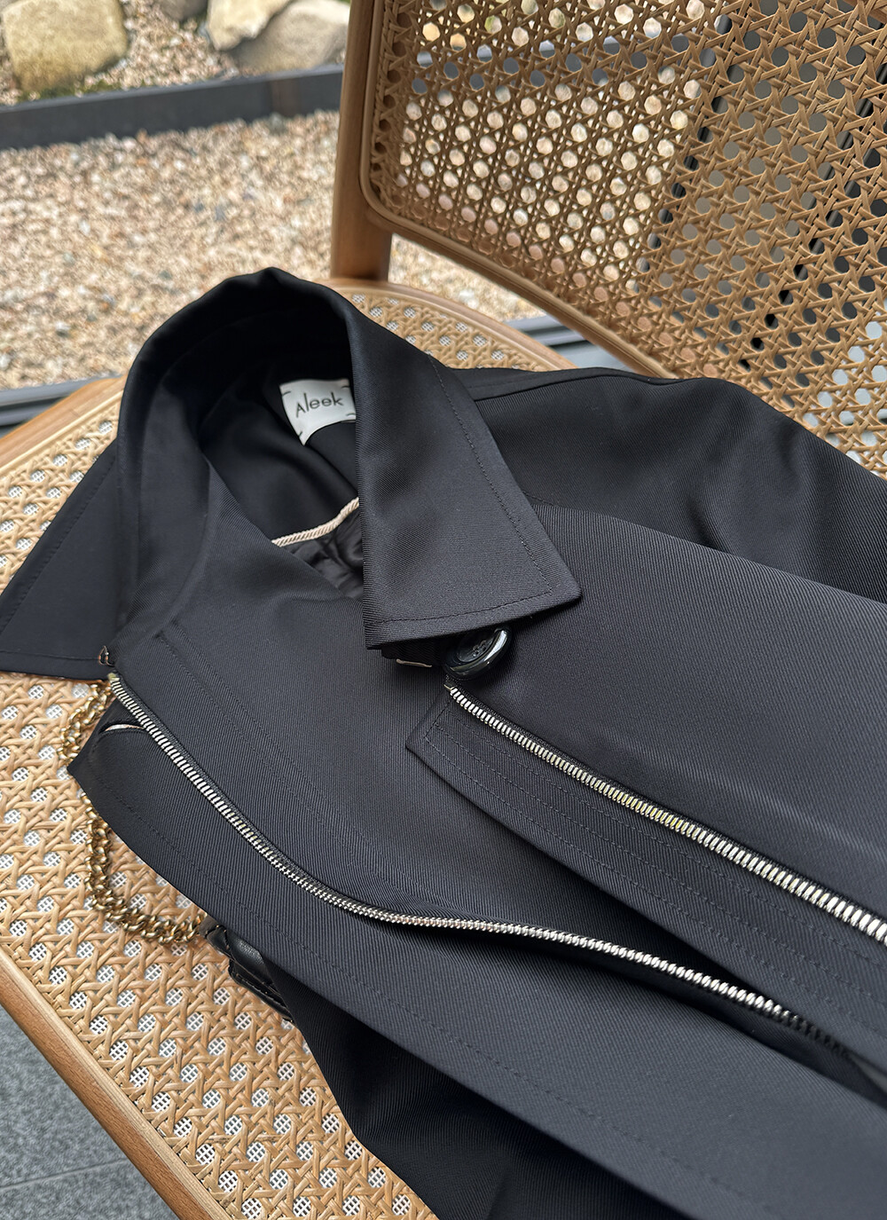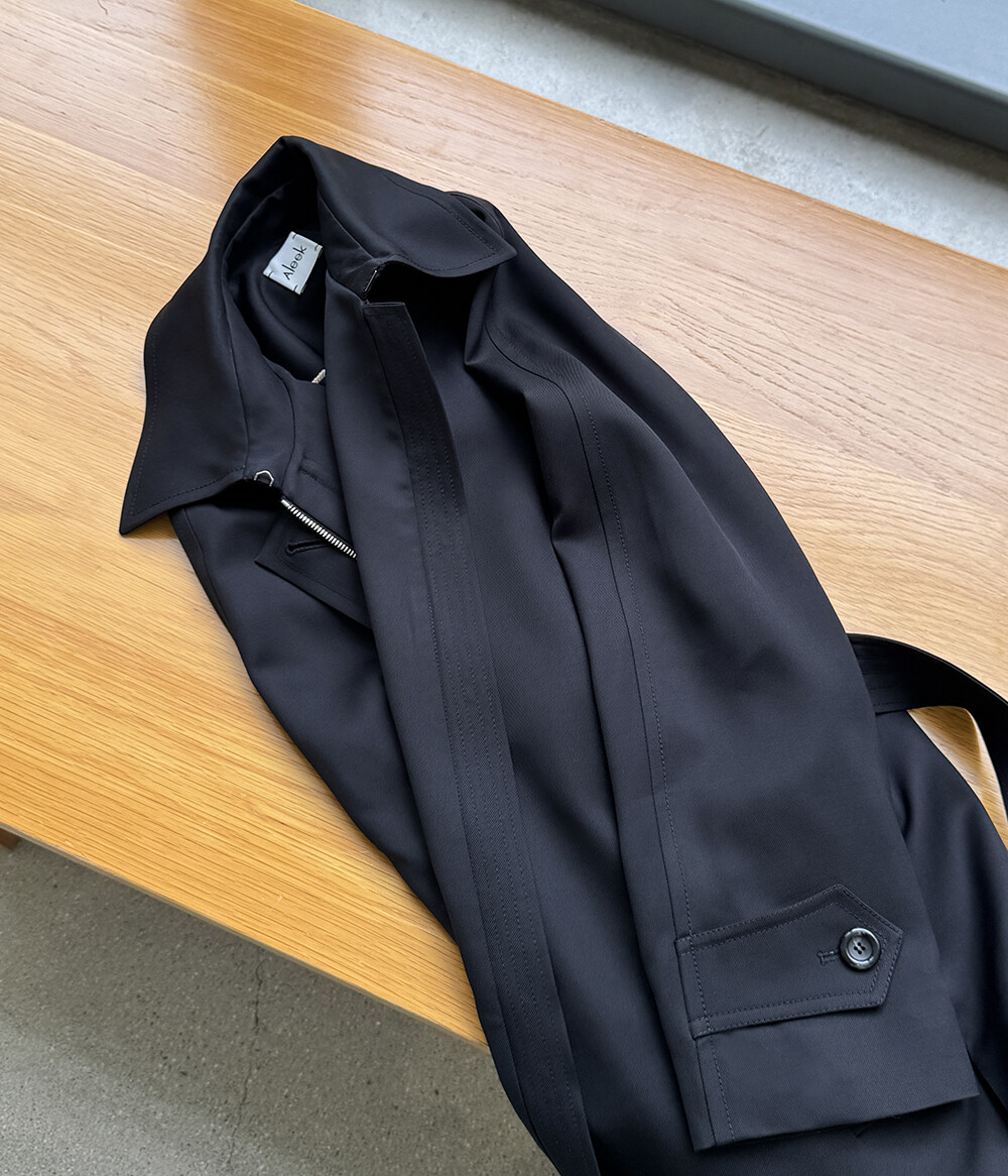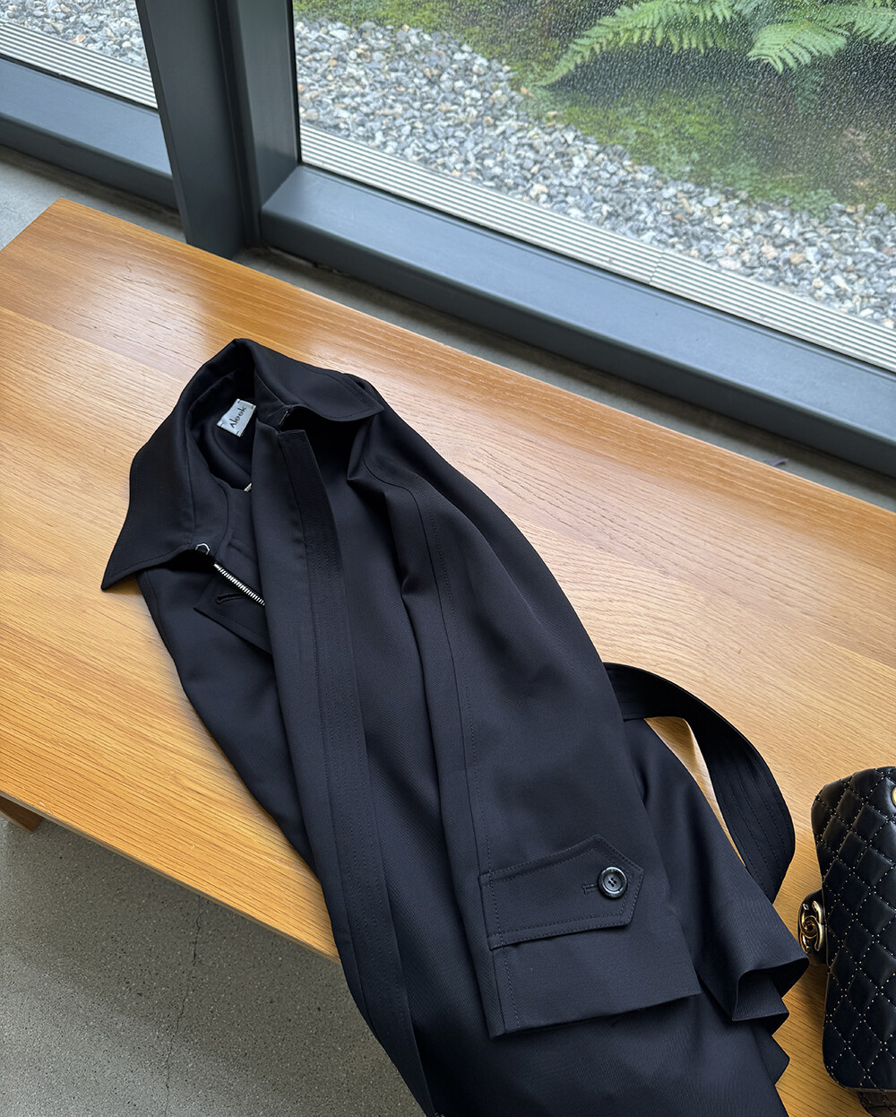 Aleek Wool Blended Raglan Sleeve Minimal Half Trench Coat 는 이태리 수입 400g대 울/비스코스 블렌드 트윌 원단으로 이태리에서 수입된 원사를 일본의 정통 천염염색으로 유명한 호쿠리쿠 지역에서 초고밀도 직조기술을 이용하여 완성된 원단으로 제작한 간절기 / 초겨울 전용 트렌치코트 입니다. 울이 주는 자연스러운 보온성과 탄탄한 조직감에 비스코스의 유연한 드레이프가 더해져, 구조적이면서도 흐르는 듯한 실루엣을 동시에 구현하고 있는 실용성 높은 나그랑 소매의 하프기장의 트렌치 코트로로 400g 중반대 중량감은 가을, 초겨울의 선선한 바람과 봄의 잔잔한 기온 변화에 가장 적합한 무게로, 두툼하지 않으면서도 충분한 보온성을 제공해 레이어링이 자유로운 ‘시즌리스’ 아이템으로 자리합니다.