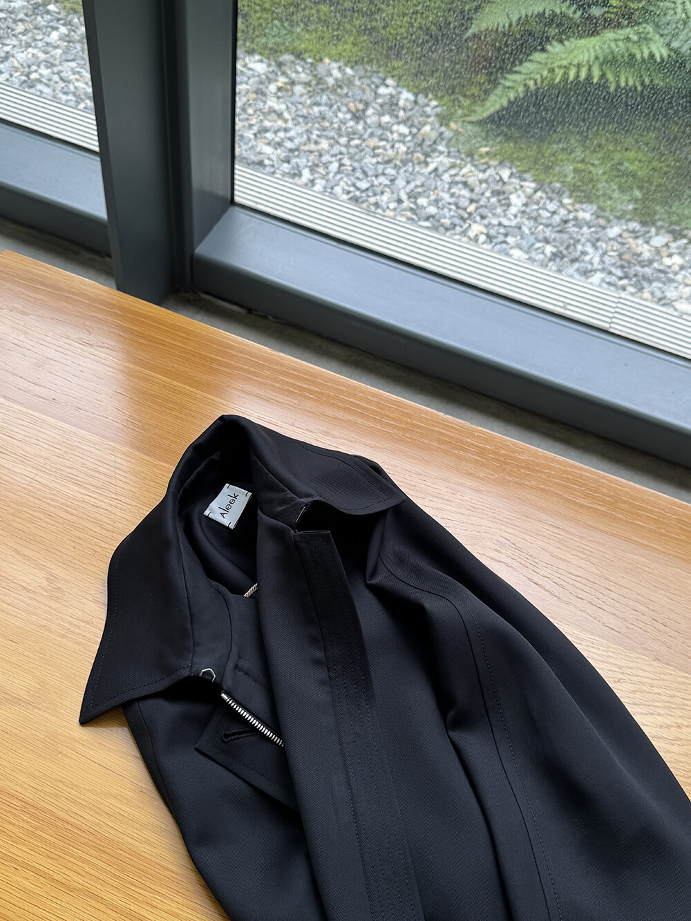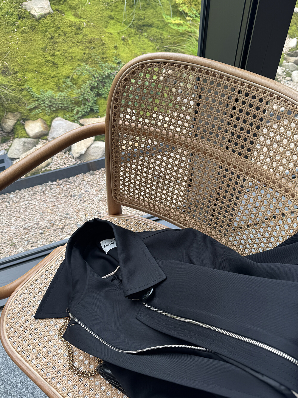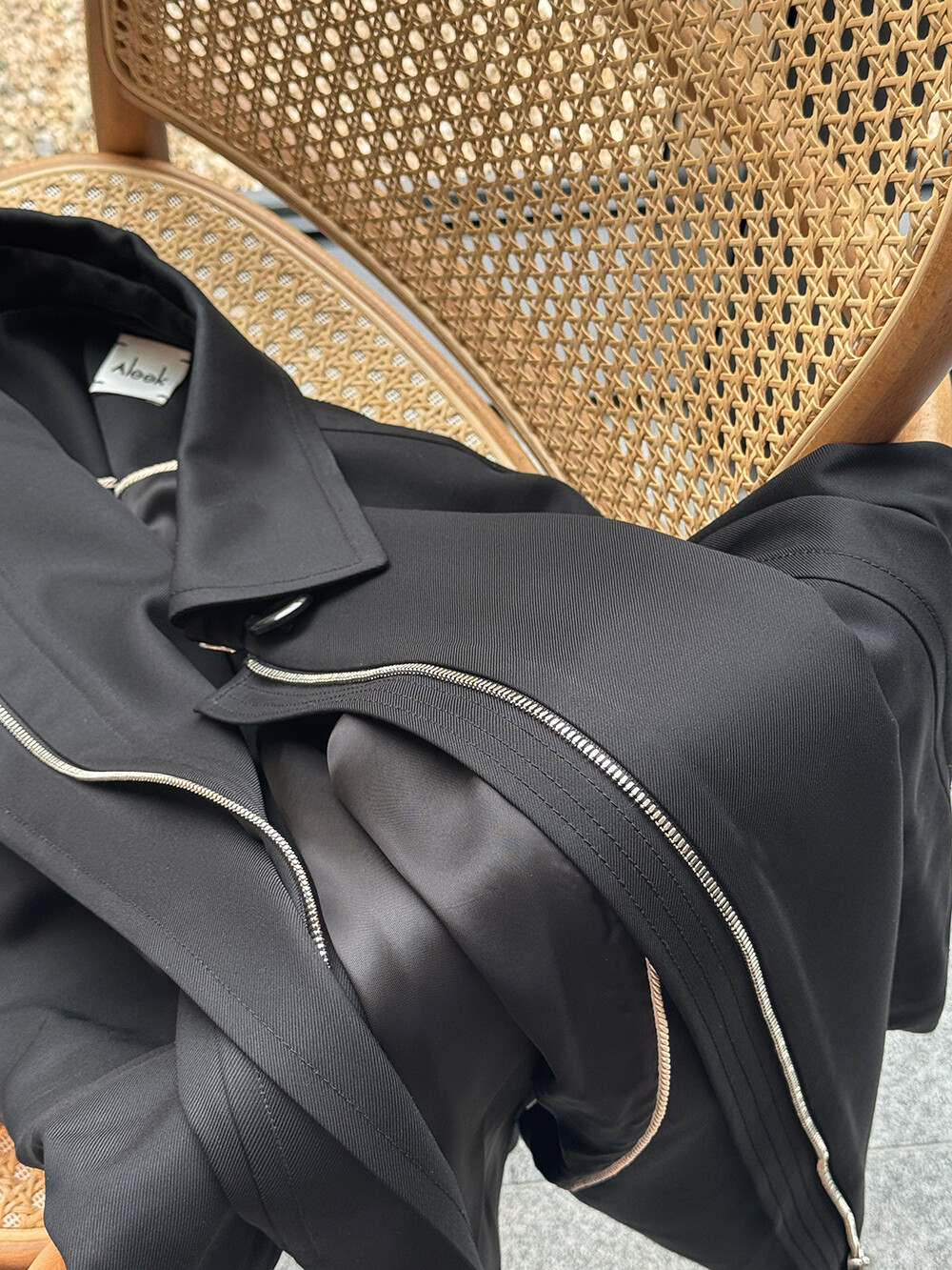 아리크가 지향하는 클래식 미니멀 디자인과 어우러지며 이 원단은 과하지 않은 고급스러움으로 완성됩니다. 너무 튀거나 과하게 노출되는 디테일을 최소화하고 안정감 있으면서 적재적소에 아리크만의 세련된 디테일을 더하고 장인정신이 깃든 봉제 마감하였습니다. 이번 시즌 아리크에서 제안하는 울/비스코스의 하프 길이의 트렌치코트는 착용 하시기에 효율적이면서 가을의 트렌치코트의 멋스러움을 놓치지 않는 에센셜 아이템으로 니트 위에 가볍게 걸쳐도 도시적인 분위기를 만들고, 셔츠·블라우스와 레이어드하면 더 정제된 오피스 룩으로 변신합니다. 제안드리는 미드나잇 잉크 블랙 컬러는 깊이 있는 클래식 톤으로 탁하지 않는 블랙으로 자연광의 빛에서 더욱 빛을 발하며 호쿠리쿠지역의 필라멘트 기법과 천연염색이 결합하여 균일하고 깊은 블랙컬러를 느껴보실 수 있습니다.