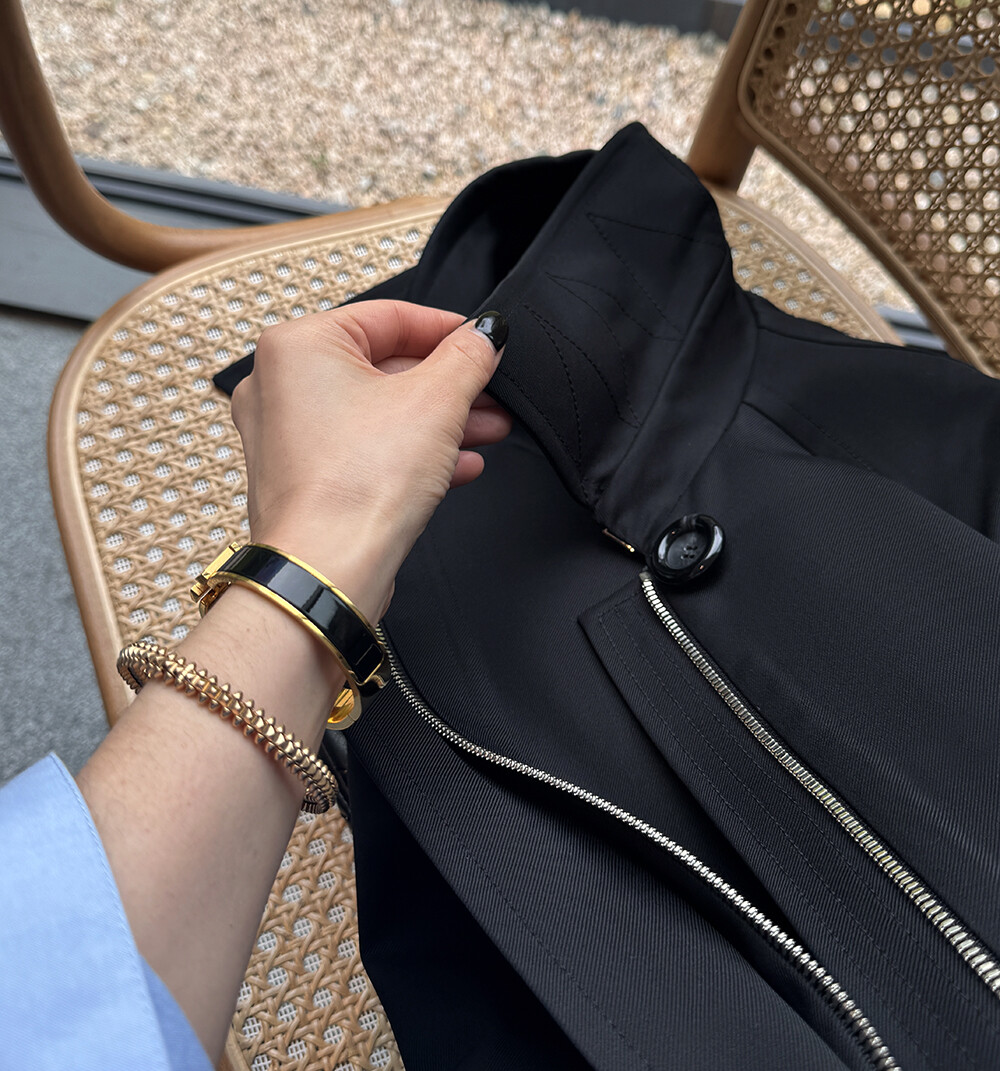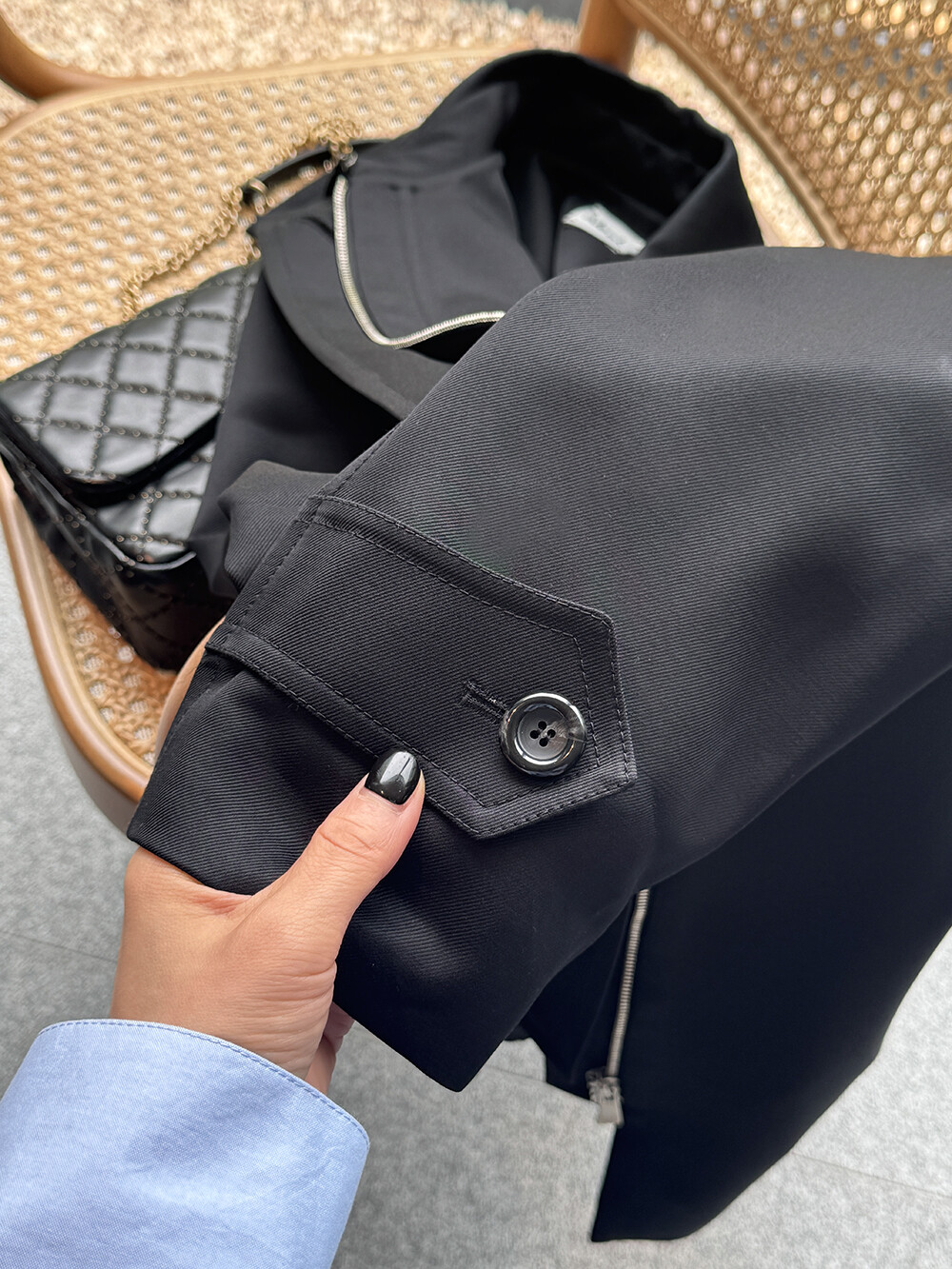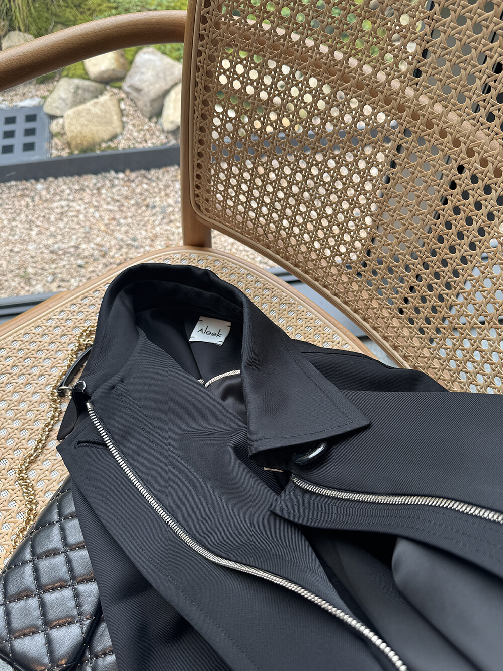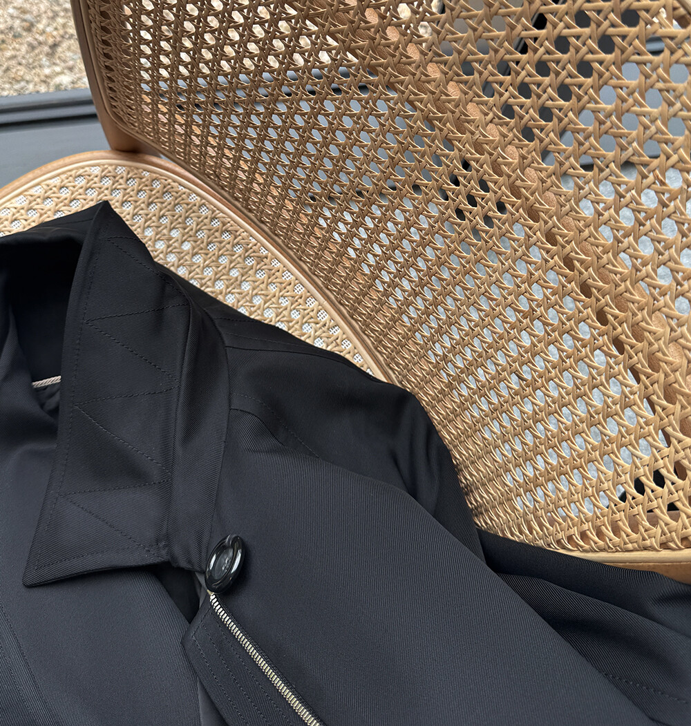 아리크가 지향하는 클래식 미니멀 디자인과 어우러지며 이 원단은 과하지 않은 고급스러움으로 완성됩니다. 너무 튀거나 과하게 노출되는 디테일을 최소화하고 안정감 있으면서 적재적소에 아리크만의 세련된 디테일을 더하고 장인정신이 깃든 봉제 마감하였습니다. 이번 시즌 아리크에서 제안하는 울/비스코스의 하프 길이의 트렌치코트는 착용 하시기에 효율적이면서 가을의 트렌치코트의 멋스러움을 놓치지 않는 에센셜 아이템으로 니트 위에 가볍게 걸쳐도 도시적인 분위기를 만들고, 셔츠·블라우스와 레이어드하면 더 정제된 오피스 룩으로 변신합니다. 제안드리는 미드나잇 잉크 블랙 컬러는 깊이 있는 클래식 톤으로 탁하지 않는 블랙으로 자연광의 빛에서 더욱 빛을 발하며 호쿠리쿠지역의 필라멘트 기법과 천연염색이 결합하여 균일하고 깊은 블랙컬러를 느껴보실 수 있습니다.