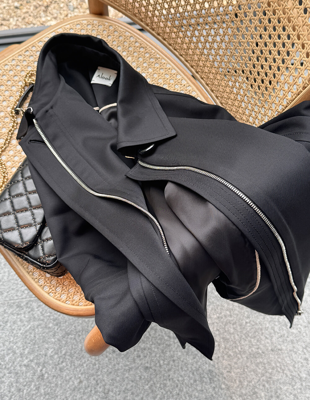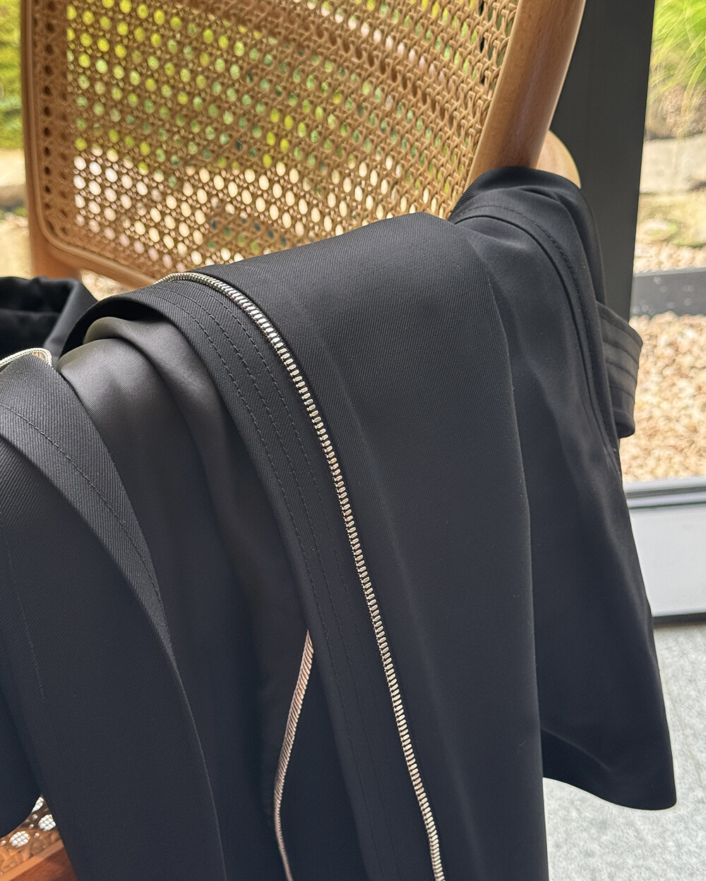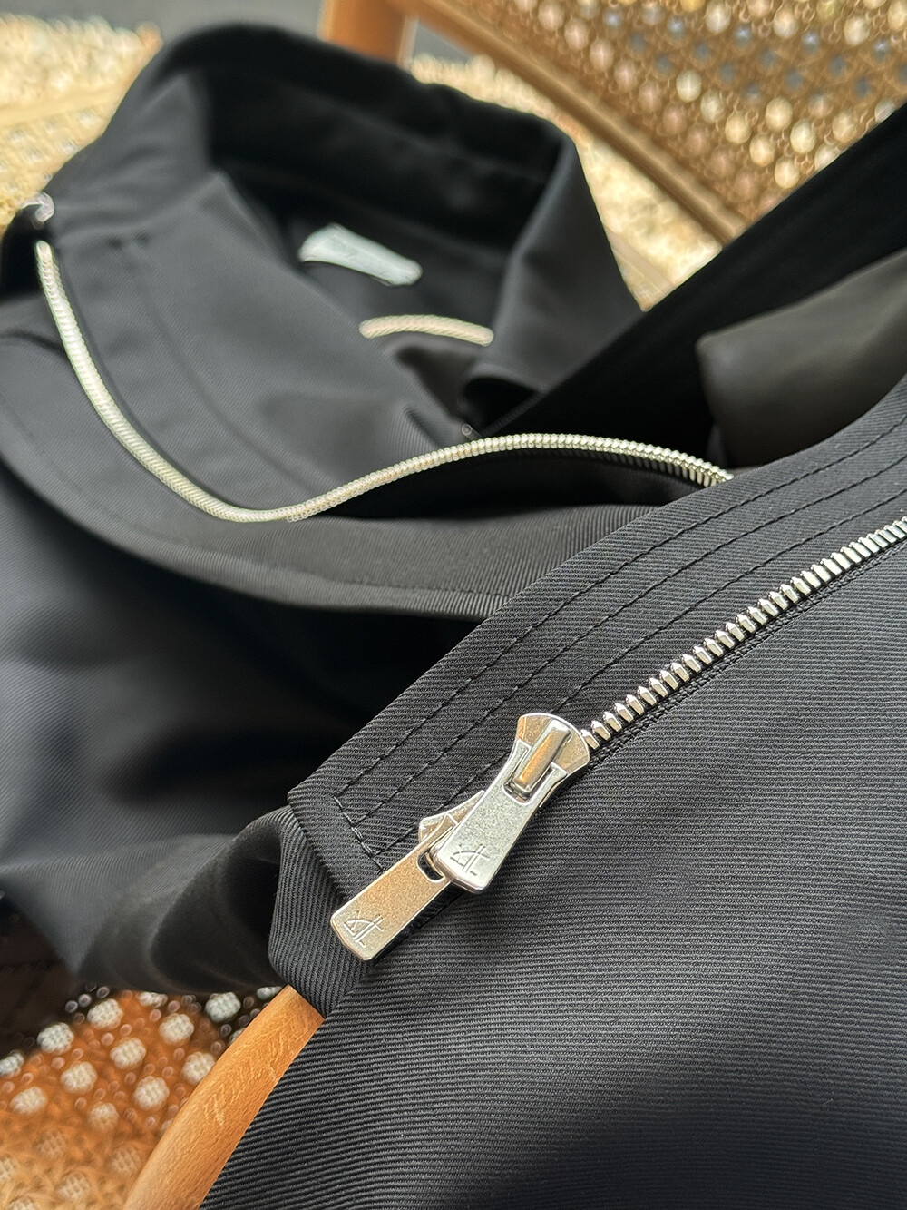 YKK 엑셀라 니켈 이중지퍼로 오픈/클로징 하실 수 있으며 플라켓 / 속플라켓의 디테일한 스티치 디테일로 오픈하셨을 때도 옷의 견고함과 단단한 마감 그리고 위에서 설명드린 필라멘트 기법을 이용한 울/비스코스 트윌원단과의 세련된 어우러짐이 옷의 완성도를 더욱 높이고 있습니다.