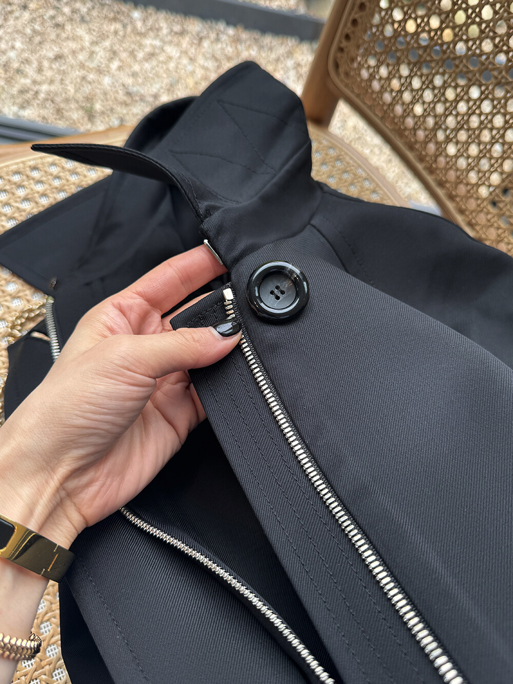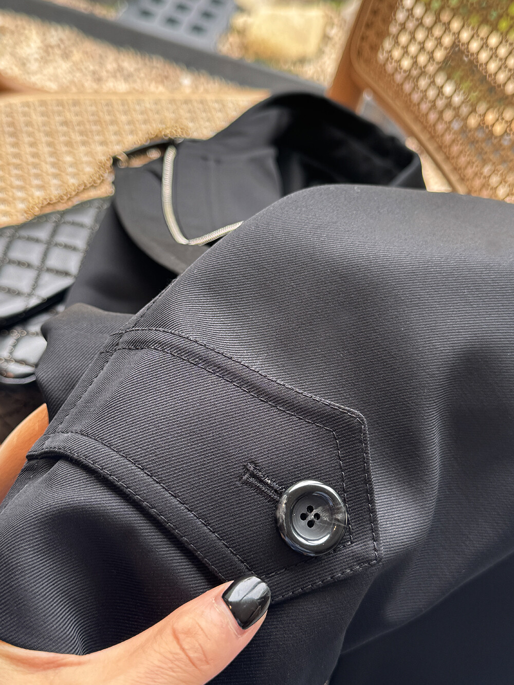 단추는 원단 컬러에 맞춰 블랙광과 마블의 형태가 은은한 단추를 사용하여 마감하고 자켓을 오픈시 보여지는 안감의 장식으로 수입트위스트 밴드를 사용하여 안감에 포인트 주어 트렌치코트를 오픈시에도 더욱 고급스럽게 제품을 느끼 실 수 있게 마감 하였습니다.