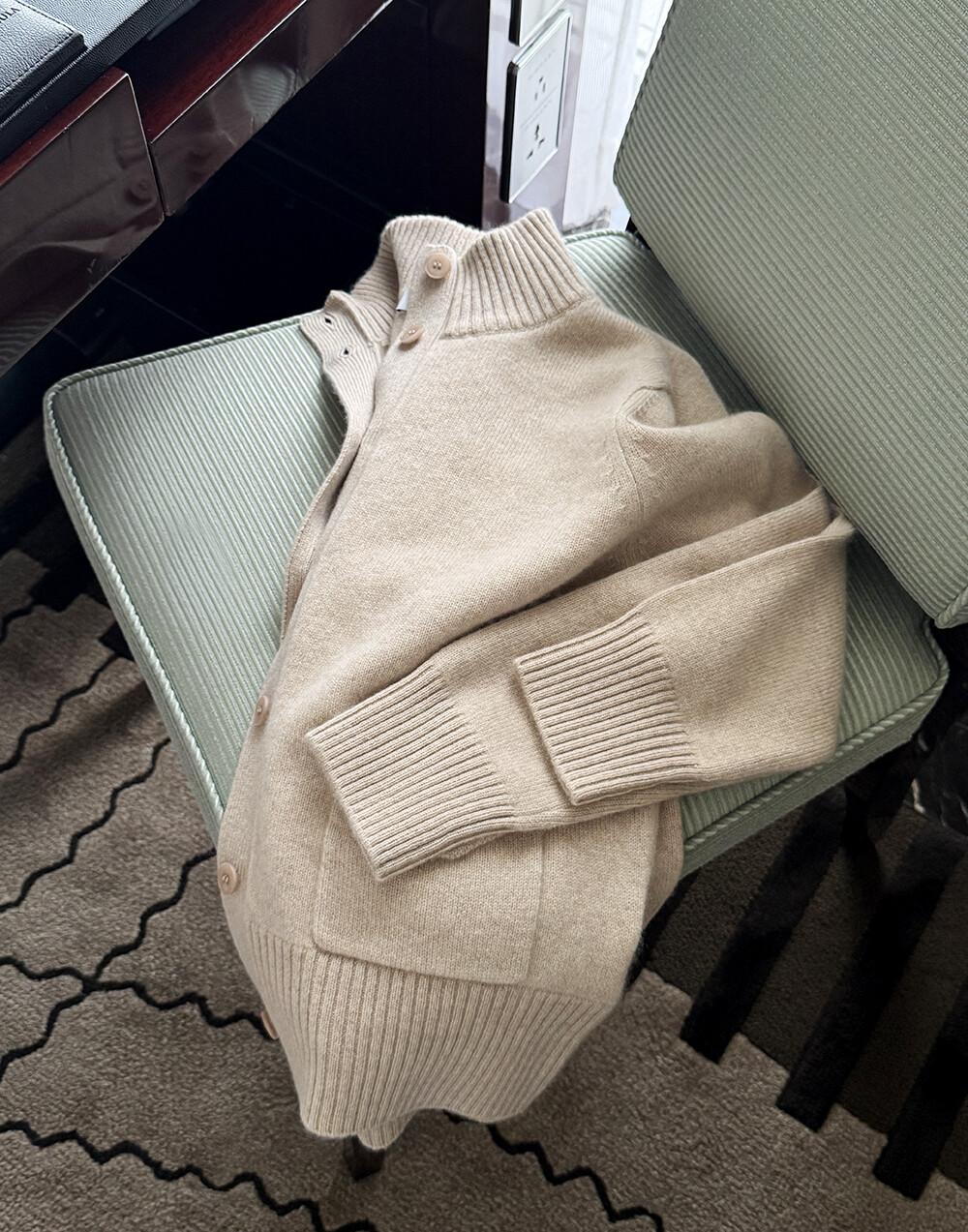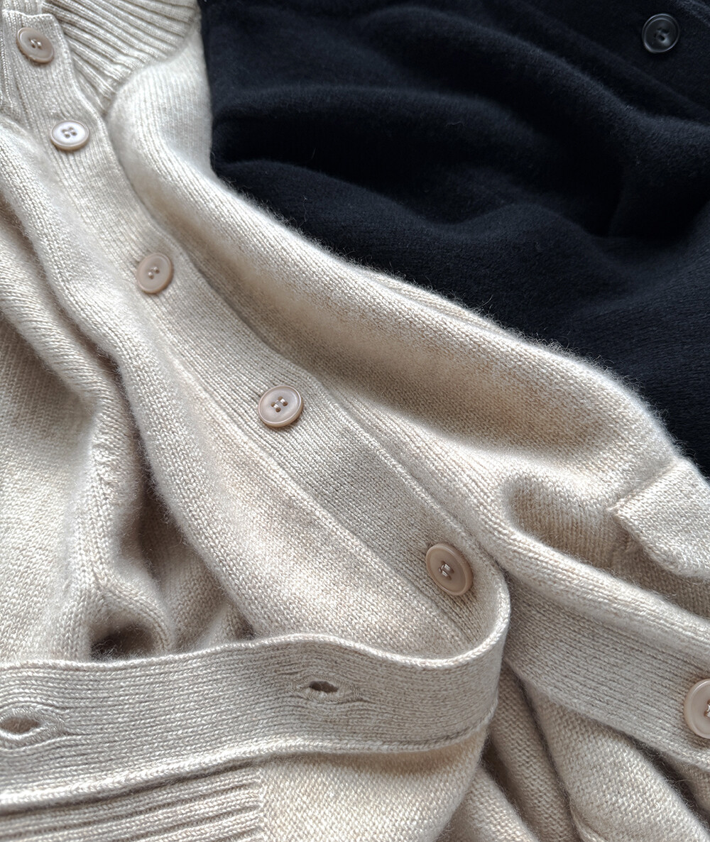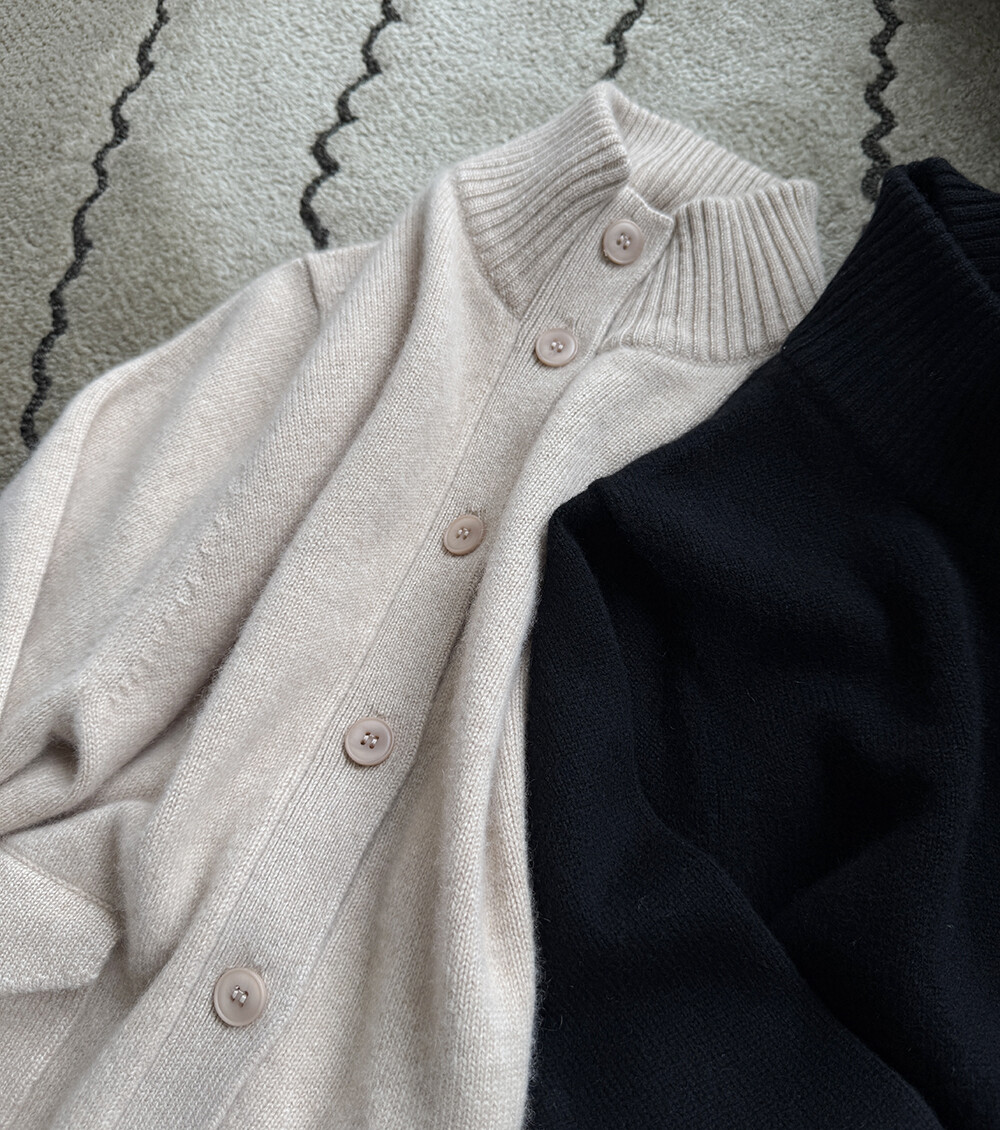 네크라인의 1/3 정도에서 시작하여 가슴과 암홀이 낙낙하게 떨어지는 버튼업 가디건 디자인으로 프리미엄 퓨어 몽골리안 캐시미어 100% 소재가 300 중후반 대로 헤비 캐시미어 라인의 가디건 입니다.