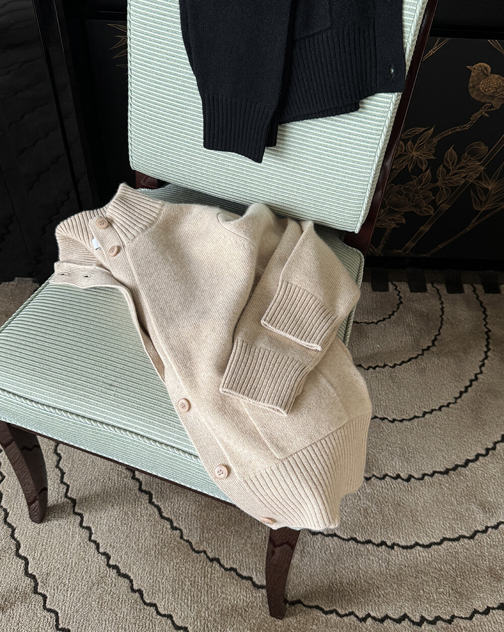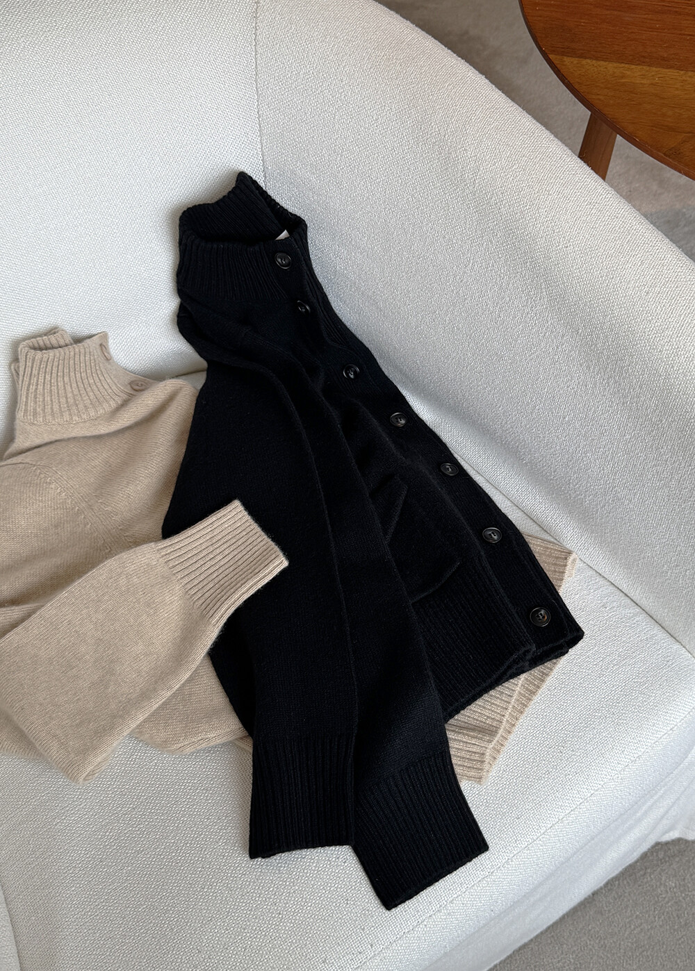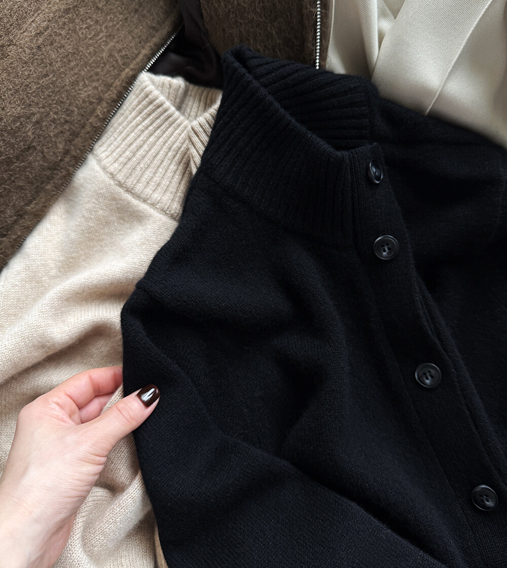 네크라인의 1/3 정도에서 시작하여 가슴과 암홀이 낙낙하게 떨어지는 버튼업 가디건 디자인으로 프리미엄 퓨어 몽골리안 캐시미어 100% 소재가 300 중후반 대로 헤비 캐시미어 라인의 가디건 입니다.