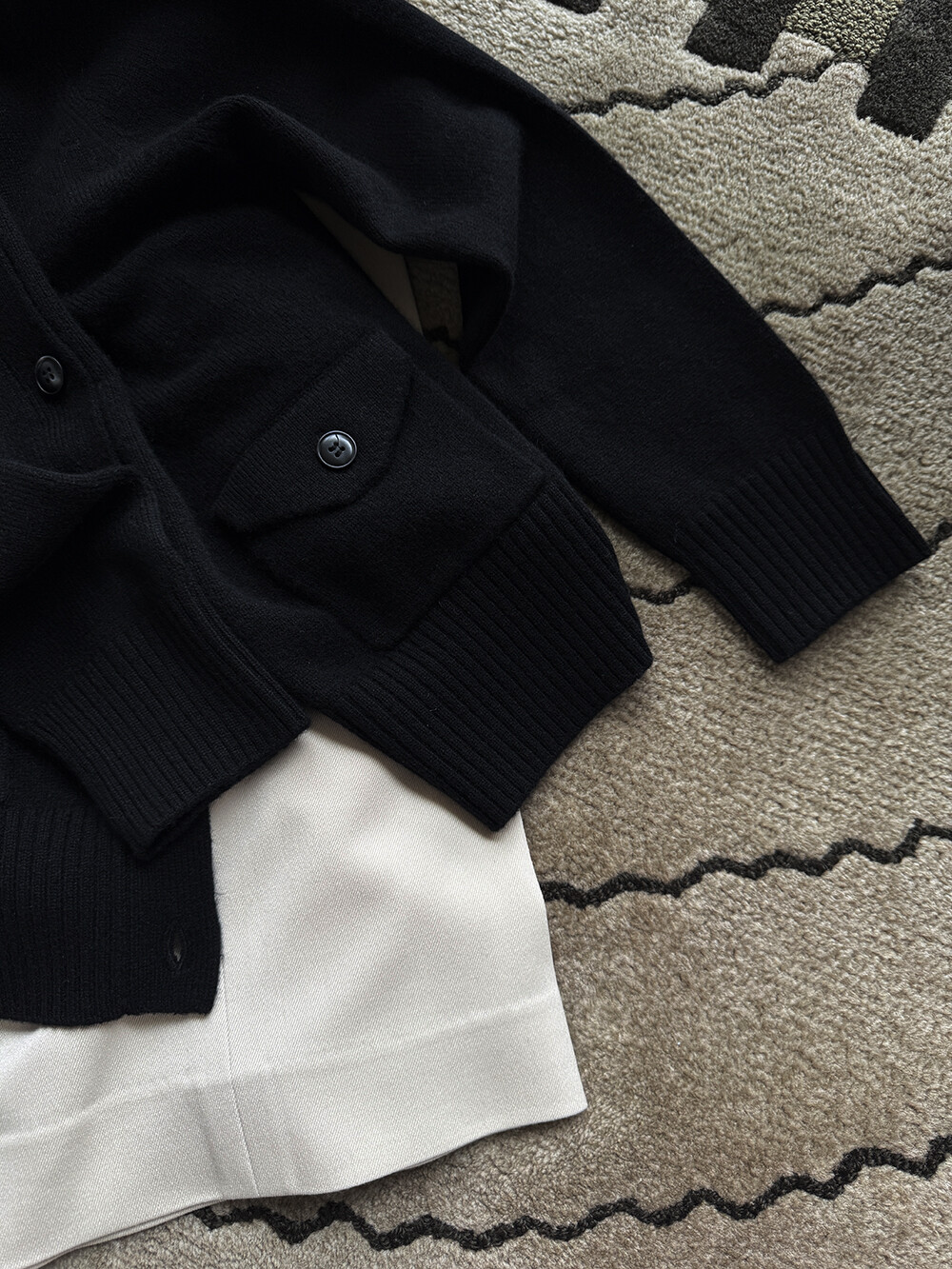 클래시하면서 미니멀한 무드를 해치지 않는 마무리감을 위해 넥라인, 소매밑단, 햄라인에 시보리 립조직감으로 마감하여 가디건의 라인들을 한번씩 탄탄하게 잡아주고 있으며 밑단의 텐션이 쪼임이 강하거나 혹은 힘 없이 무너짐 없이 골반에 살짝 걸치듯 연출하기 좋아 상체의 라인을 적당히 잡아줍니다.