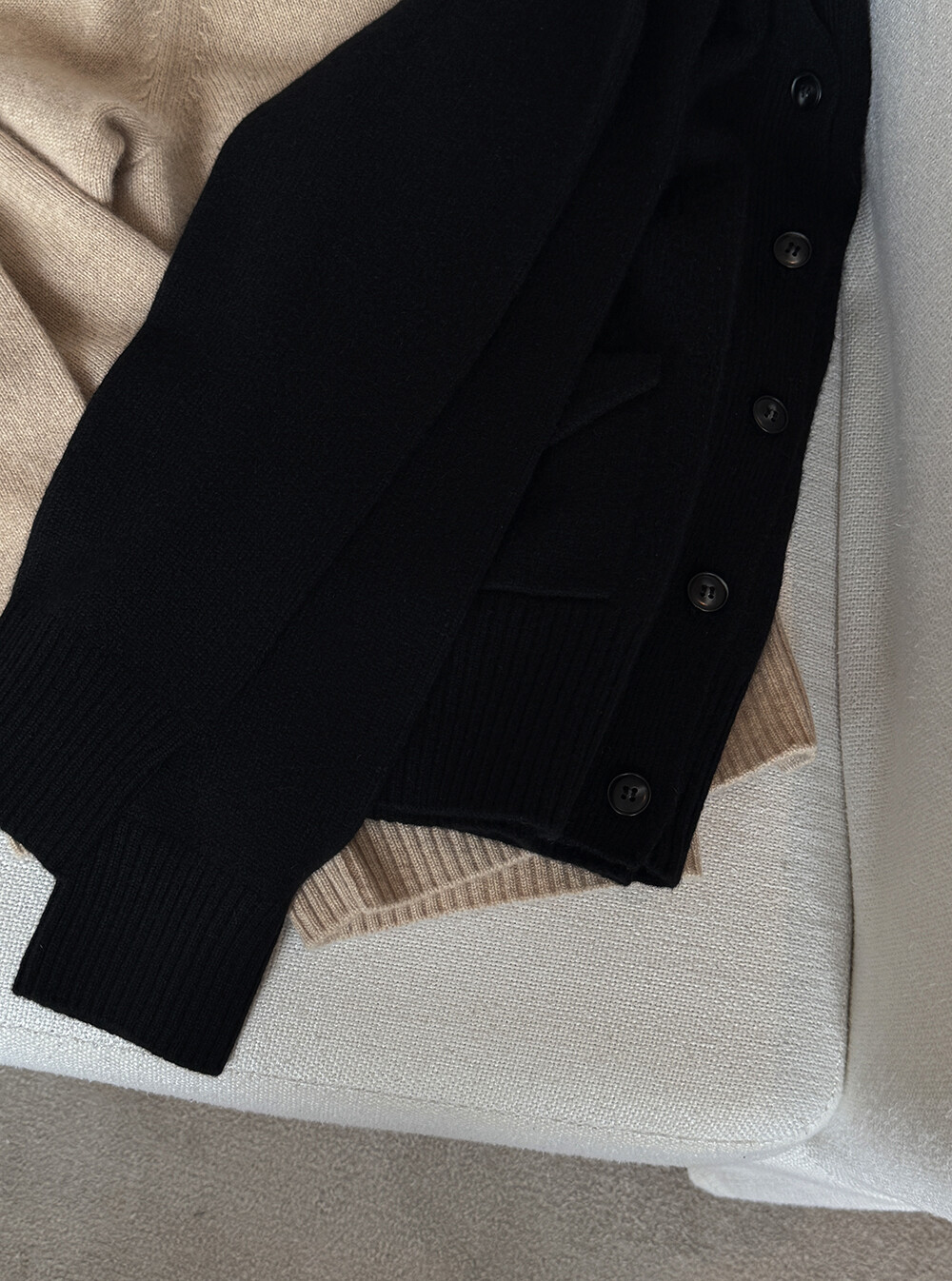 앞판 밑단의 스몰 포켓 포인트가 있으며, 포켓 안쪽의 시접 마감 또한 입체감을 넣어 많은 양의 원사와 디테일한 공정이 들어간 몽골리아 캐시미어 100 가디건을 만나보실 수 있습니다.