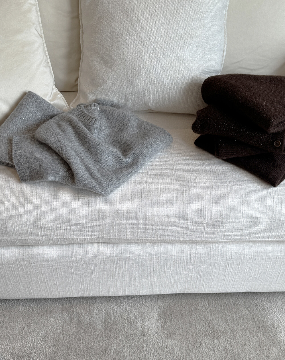 기존 캐시미어원사도 한층 더 가벼운 캐시미어를 사용하여 77%의 캐시미어와 실크 23% 원사로 짜여져