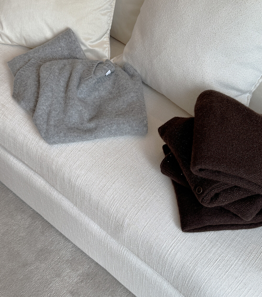 소프트하고 부드러운 터치감을 자랑하는 Mongolian Cashmere Silk Spangle Pointed Ensemble Knit Set 는