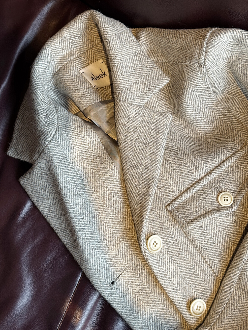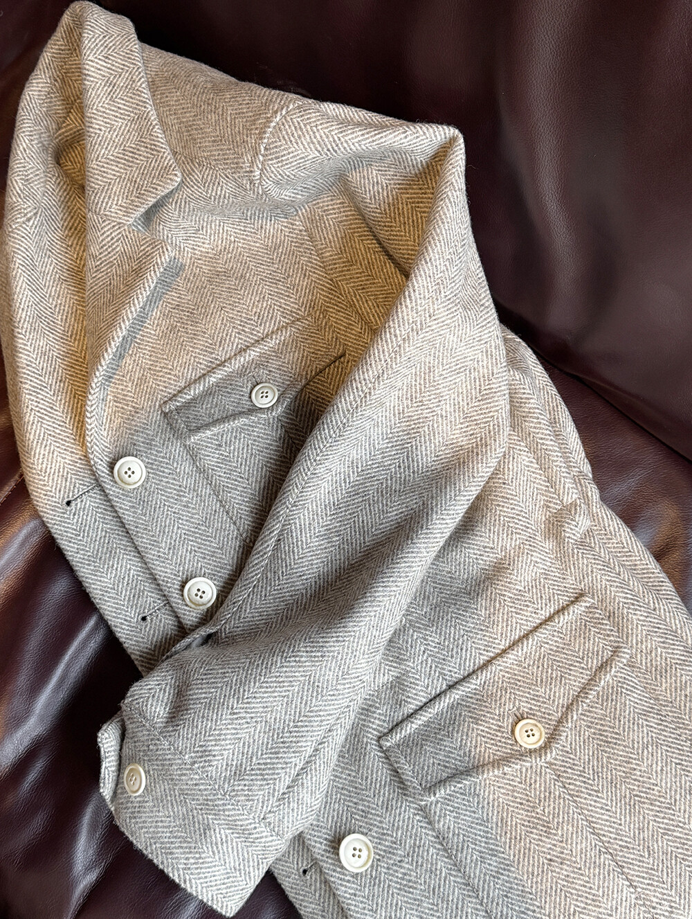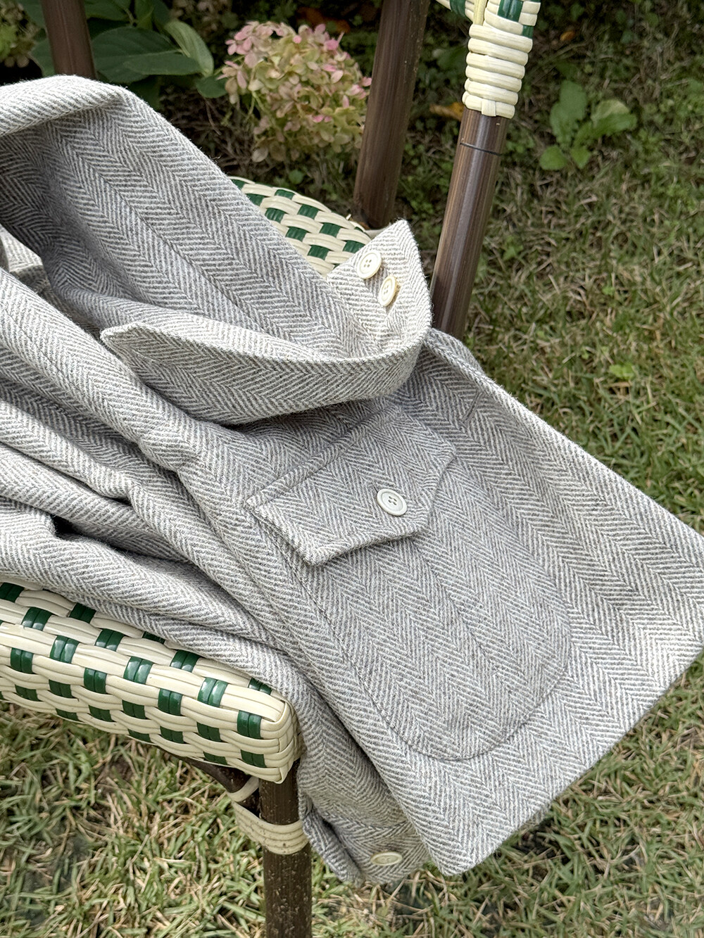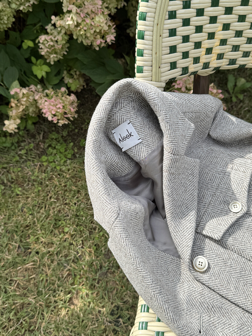 100% 울이면서 고밀도로 직조된 헤링본 조직은 질감이 풍부하고 형태감이 단단합니다. 사파리자켓처럼 실루엣이 구조적이고 아우터로서의 역할을 하는 아이템에는 이런 원단이 이상적입니다. 폭이 넓고 반복 패턴이 정교한 헤링본은 재단 시 절개선과 포켓, 카라 등의 디테일을 더욱 입체적으로 보이게 합니다. 이는 아리크가 추구하는 “절제된 디테일 속에서도 질감이 살아 있는” 미니멀한 철학과 맞닿습니다.