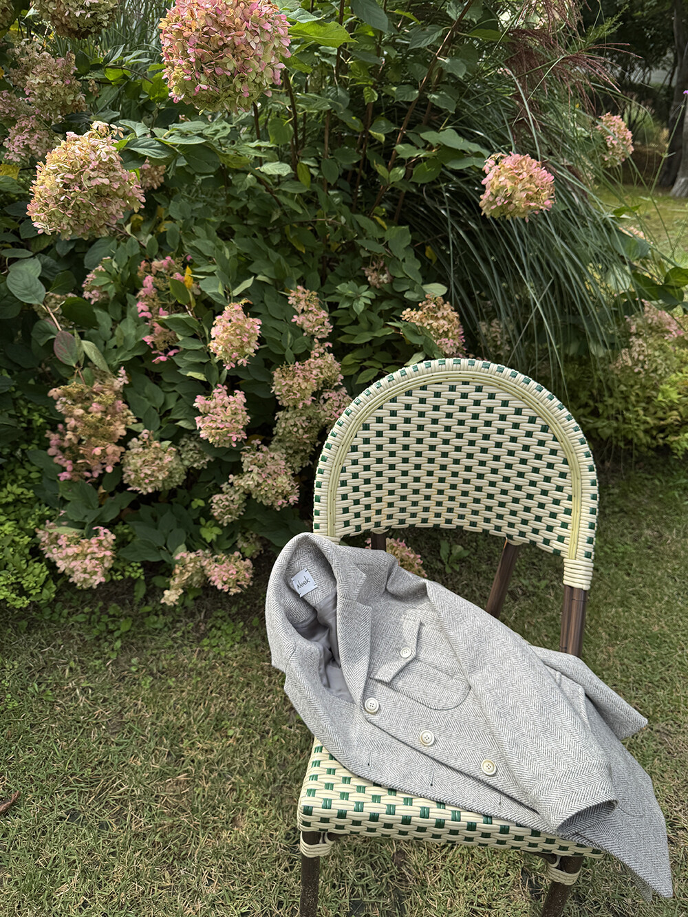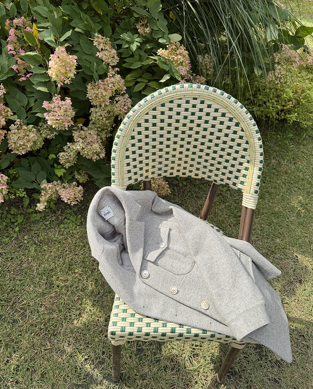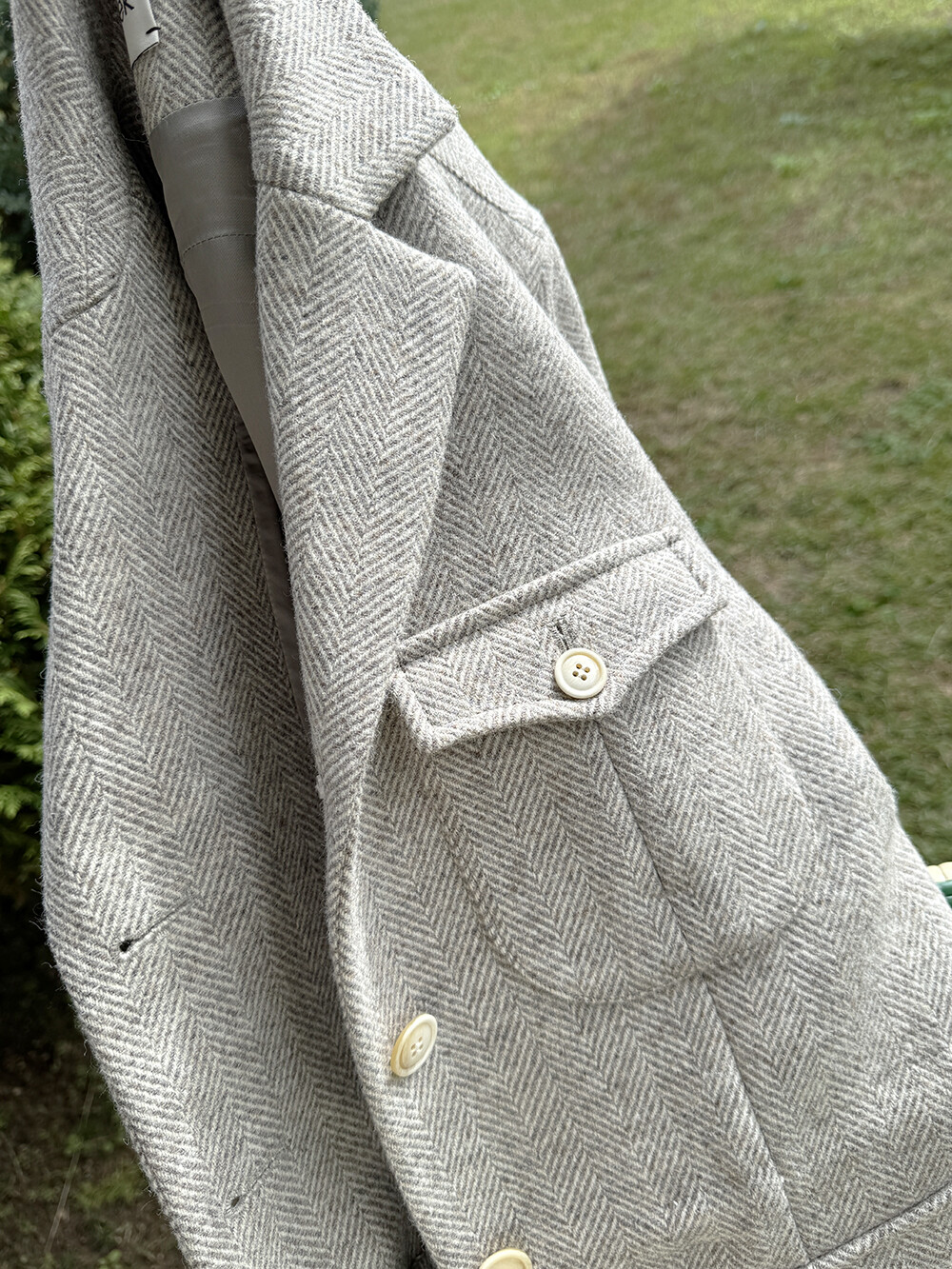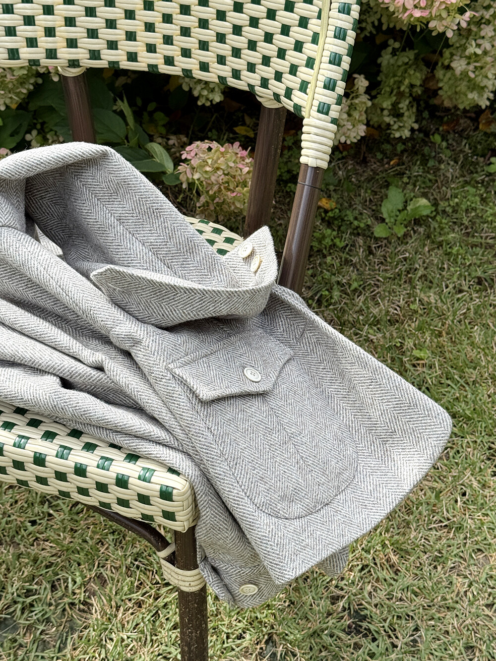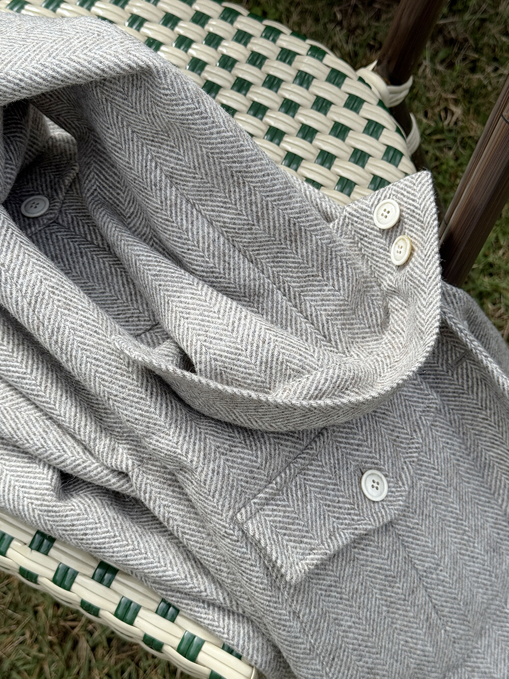 100% 울이면서 고밀도로 직조된 헤링본 조직은 질감이 풍부하고 형태감이 단단합니다. 사파리자켓처럼 실루엣이 구조적이고 아우터로서의 역할을 하는 아이템에는 이런 원단이 이상적입니다. 폭이 넓고 반복 패턴이 정교한 헤링본은 재단 시 절개선과 포켓, 카라 등의 디테일을 더욱 입체적으로 보이게 합니다. 이는 아리크가 추구하는 “절제된 디테일 속에서도 질감이 살아 있는” 미니멀한 철학과 맞닿습니다.